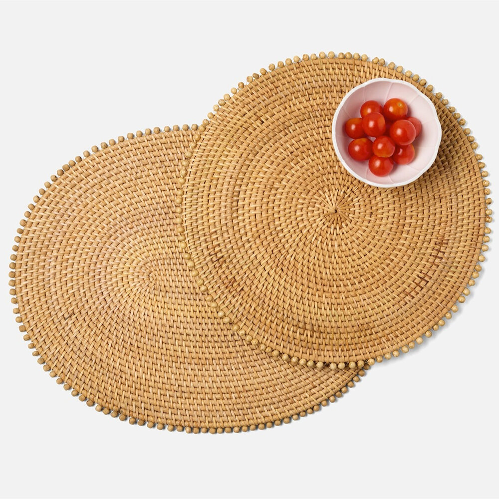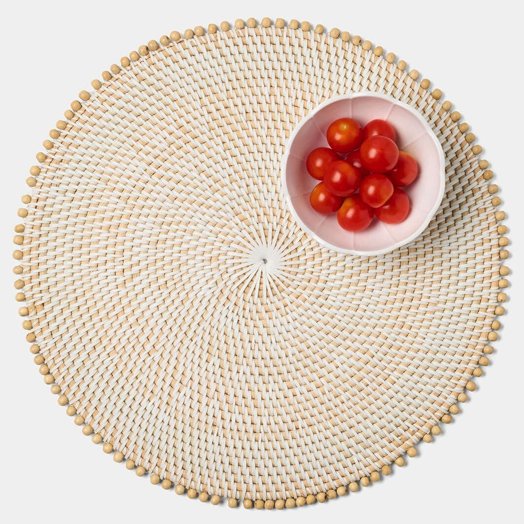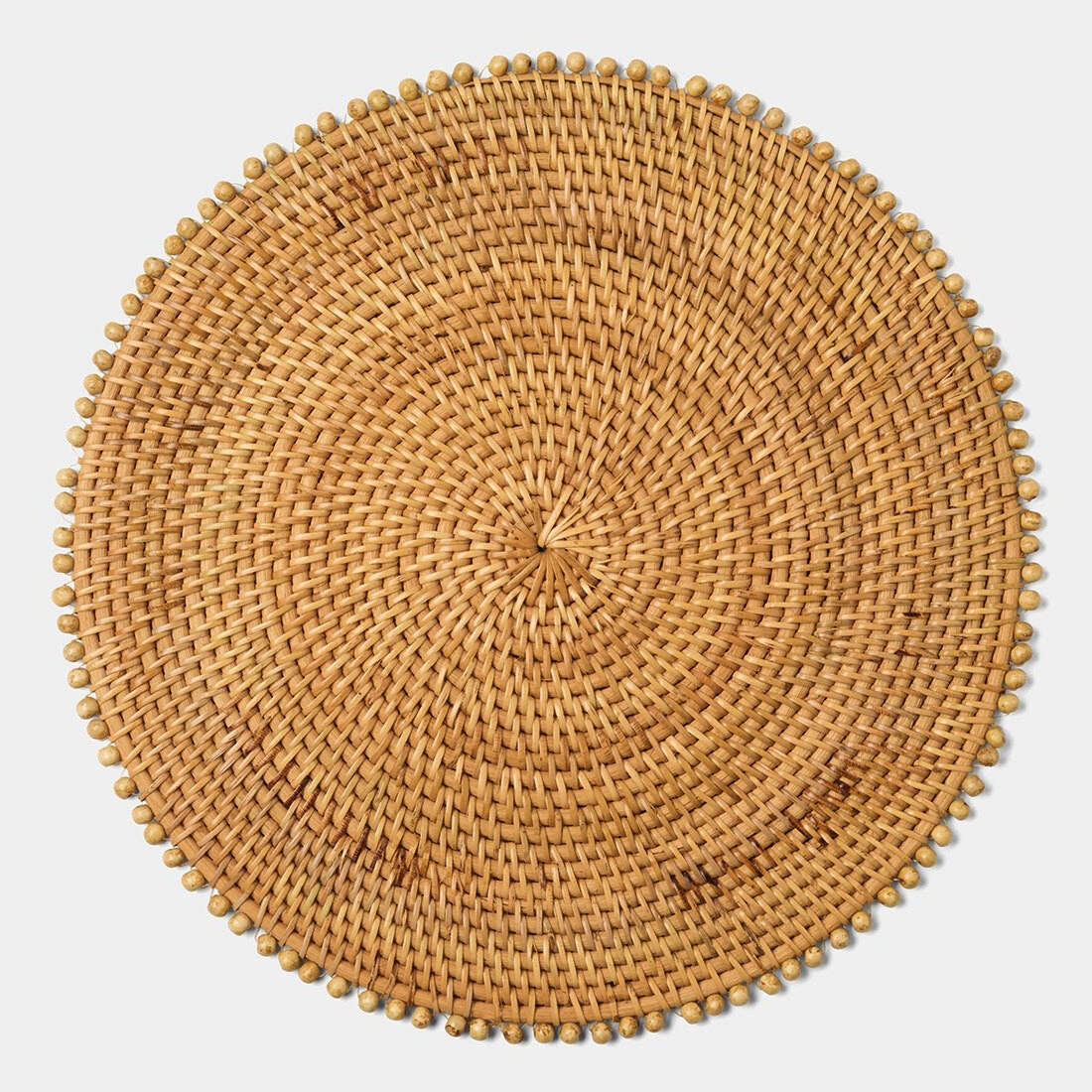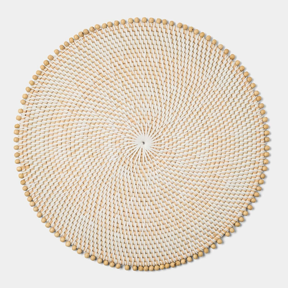 Our Cassia placemat, crafted from rattan, features a circular design radiating from the center with wooden beads accentuating its edge.