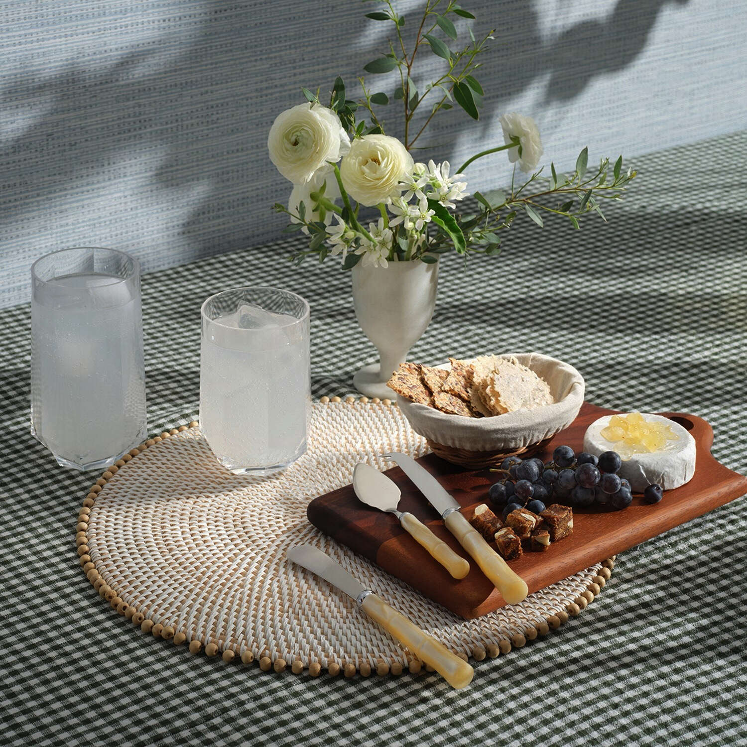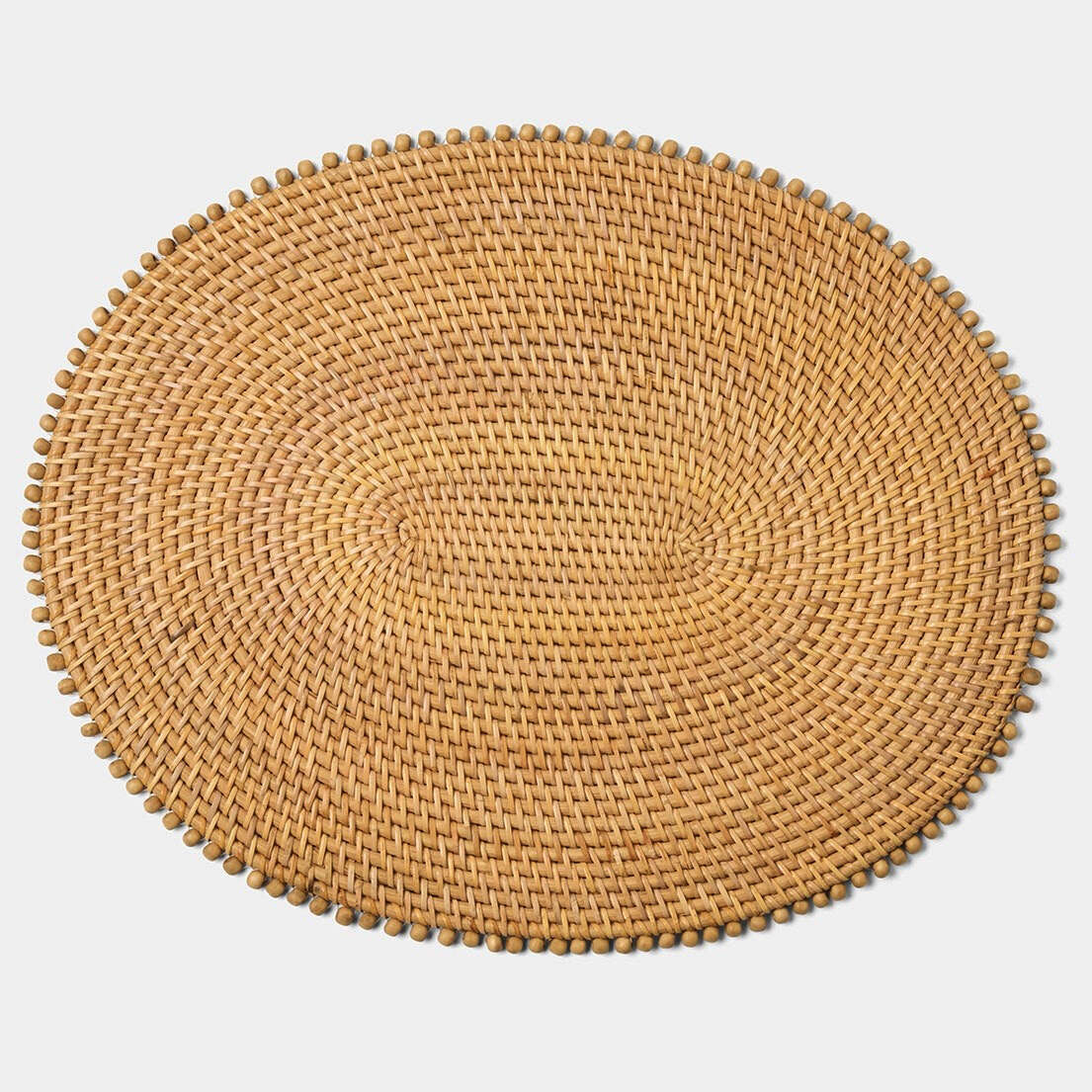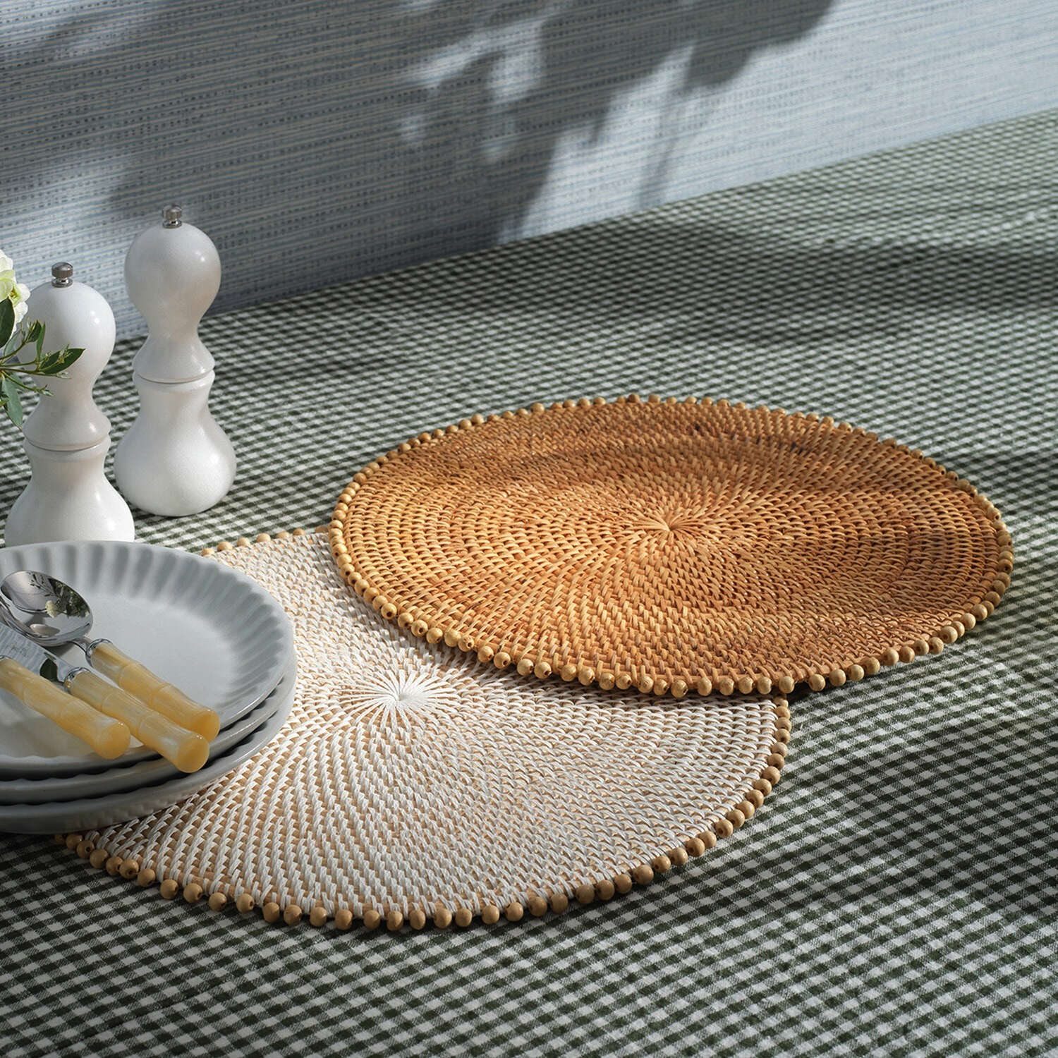 Our Cassia placemat, crafted from rattan, features a circular design radiating from the center with wooden beads accentuating its edge.