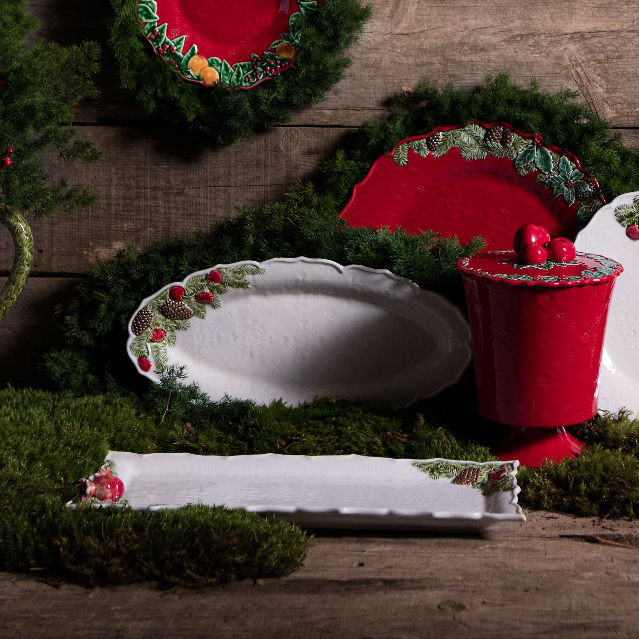 Inspired by Christmas garlands, a symbol of peace and prosperity, the new Bordallo Pinheiro’s Christmas table set has surprised, by the combination of this season’s traditional elements and unexpected elements, such as oranges, pomegranates, strawberries and chili peppers. Each piece was created as if it were a Christmas wreaths, combining three-dimensional shapes with a pattern, falling over all pieces as a Christmas wrapping paper. A unique table set which combines tradition and originality, allowing the use of utilitarian pieces as decorative pieces, for a perfect Christmas ambiance.