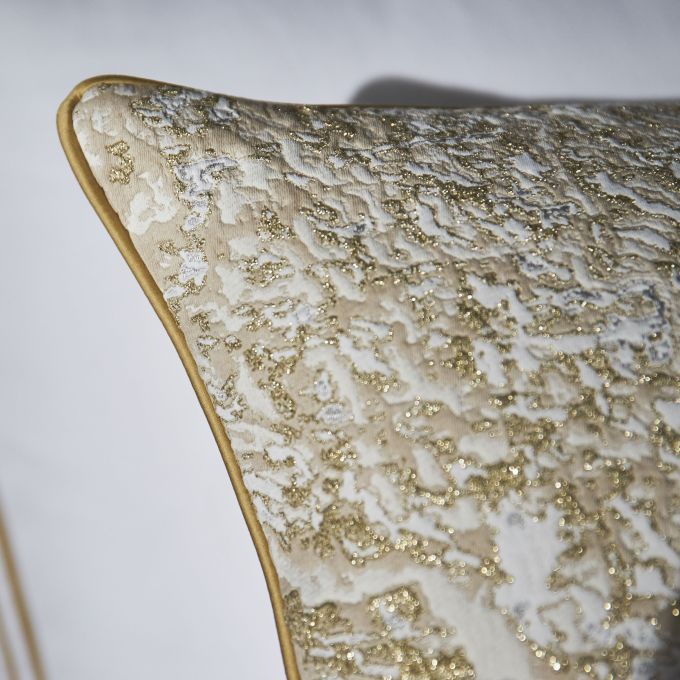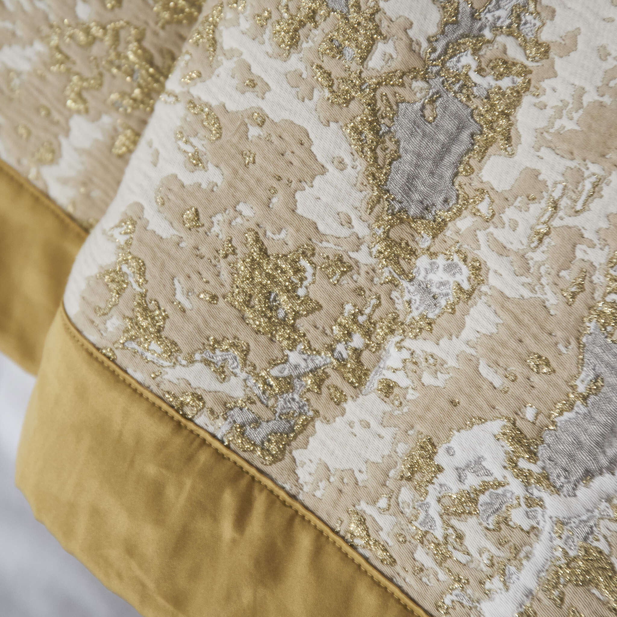 An abundance of gold, silver, and glitter in rich overlapping patterns. Waltz, with high-quality cotton, is available in a lavish bed quilt with matching shams.
