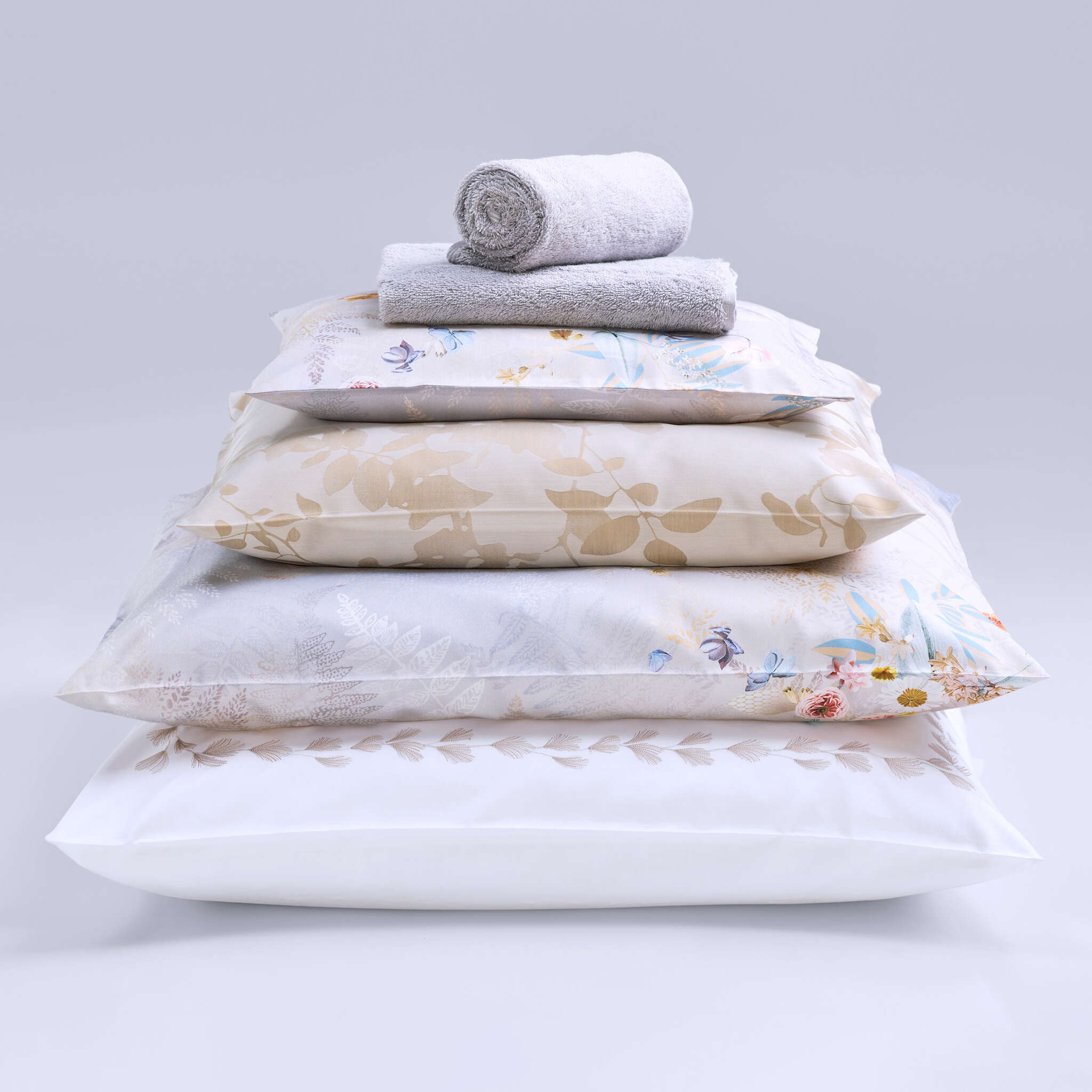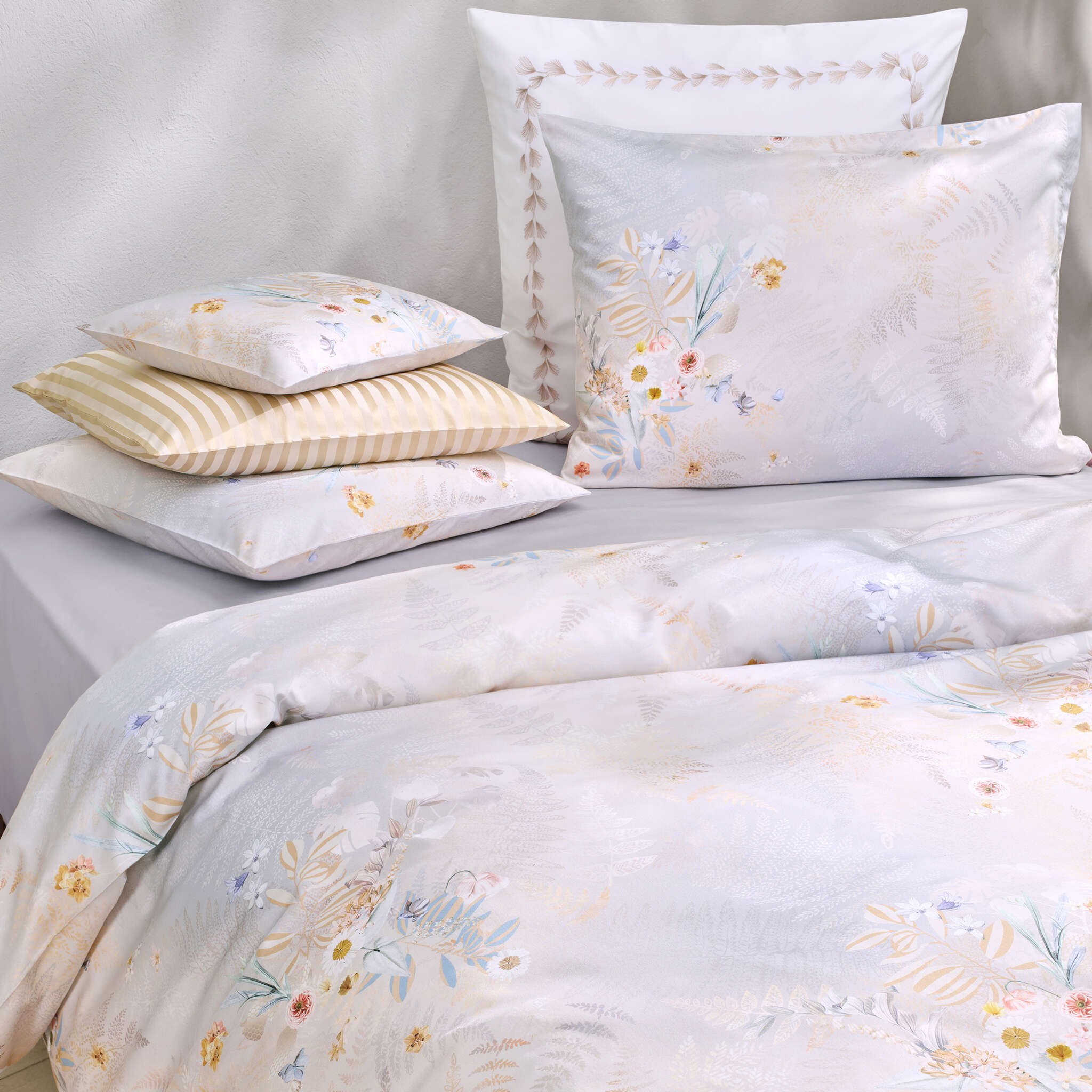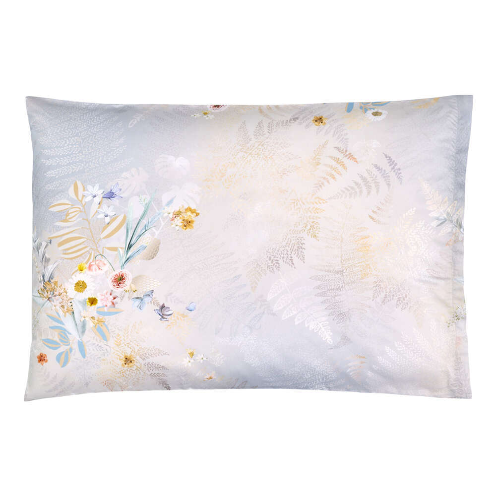 Matching the jacquard design fern, Eternity takes the fern motif as a symbol of eternity and durability. Flower bouquets of hydrangeas, poppies and African lilies form a harmonious composite on the finely drawn fern leaves. The elegant bed linen in elegant silver, beige and gold tones fits effortlessly into a wide range of interiors and gives your bedroom a luxurious atmosphere.