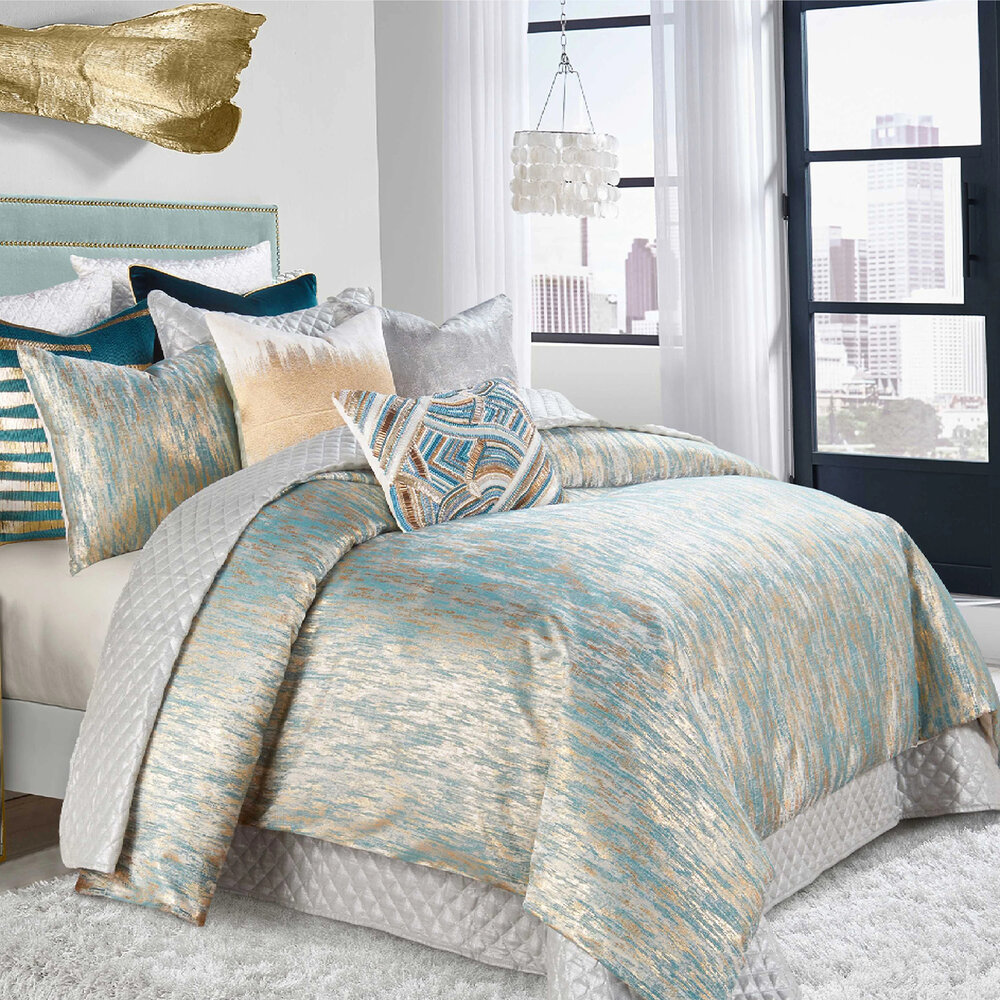 Elevate your bedding with our exquisite teal-blue duvet, adorned with gleaming gold foil. This striking color combination harmonizes seamlessly with every season, offering timeless elegance and versatility. Embrace the opulence and sophistication it brings to your space, creating a haven of luxurious comfort and style. Redefine your decor effortlessly with this stunning duvet, where every detail reflects a commitment to refined beauty and a touch of glamour.