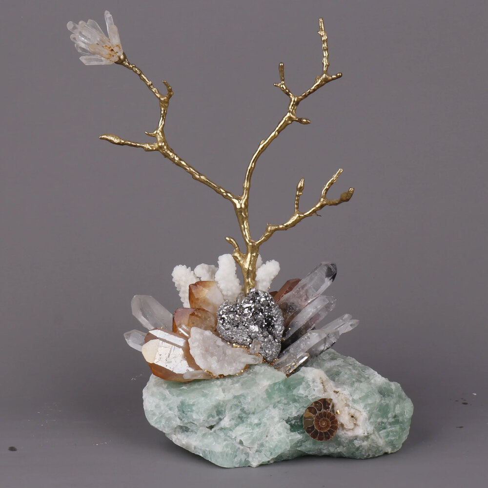 Bring a touch of enchantment to your space with this breathtaking ornament, where natural elegance meets timeless romance. Resting on a raw green fluorite base, the piece showcases an assorted crystal fossil that seems to hold secrets of the ages. A sleek brass stick delicately bridges these natural wonders, creating a harmonious union. Perfectly sized at 7.87 x 7.09 x 13.78 inches, this ornament exudes sophistication, blending earthy allure with a modern touch. It's a poetic reminder that beauty is found in the perfect balance of strength and grace.