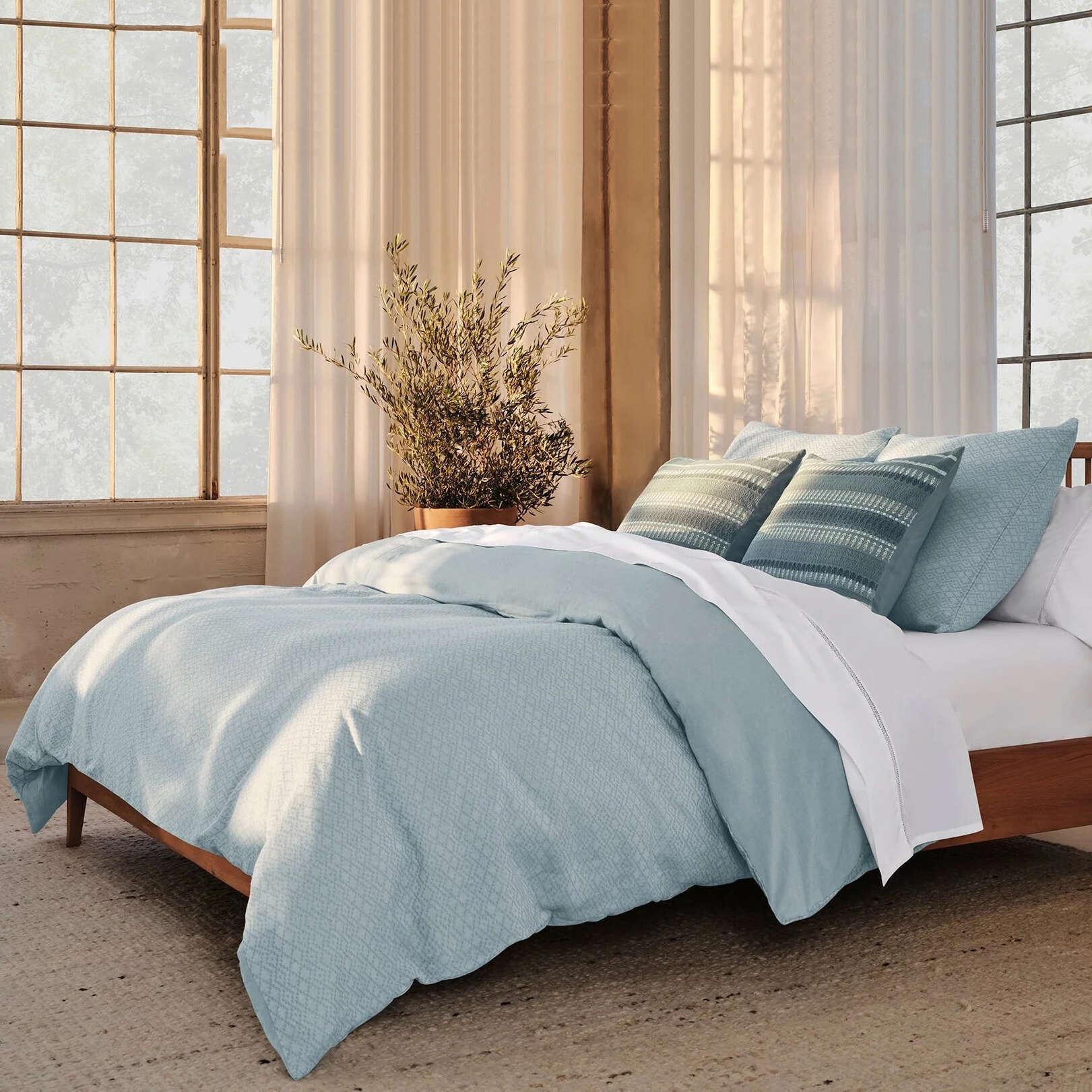 An exquisite diamond pattern brings luxurious texture to our Capitola Organic Duvet Cover, crafted with a tactile, dimensional weave. Its matte, soft feel offers year-round comfort, while 100% certified organic cotton promotes better sleep quality, night after night. Layer with a spectrum of nature-inspired hues to bring out the design’s beautiful highs and lows.