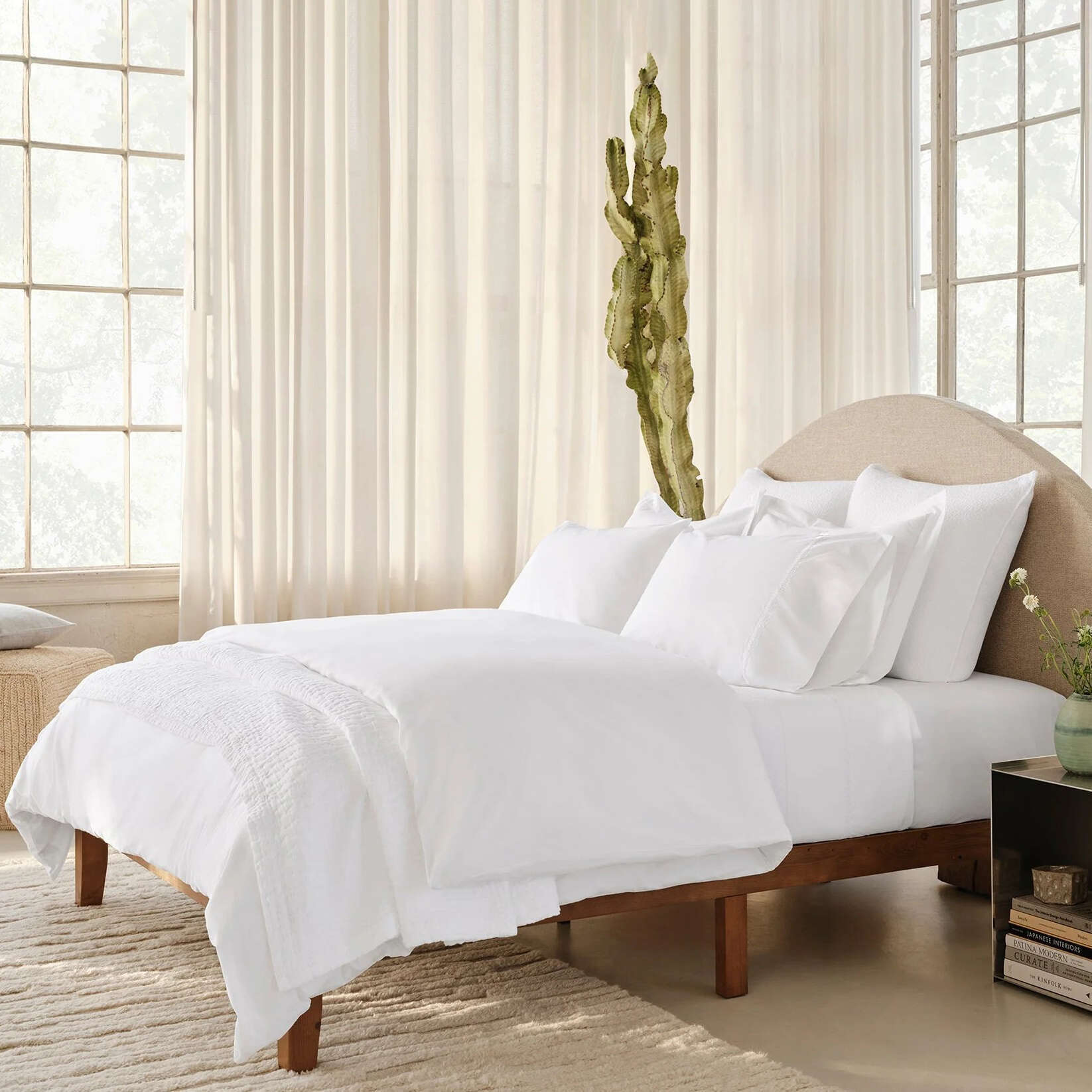 Our Pescadero Matelassé Organic offers a soothing blend of wave-like texture and gentle comfort. Crafted in Portugal from 100% GOTS certified organic cotton, the drapey matelassé weave features a soft sateen construction on the face and a gauzy texture on the reverse, delivering a range of softness. Perfect as a standalone coverlet or layered over a duvet, it adds elegance and warmth to your bed. Complete with a 1.5" turned hem and mitered corners for a clean, polished look. The Pescadero Matelassé Organic Sham, inspired by waves. Crafted in Portugal from 100% GOTS certified organic cotton, it features a soft sateen weave. Designed with knife-edge construction and an envelope closure, this sham pairs beautifully with the matching blanket to create an elegant and sustainable bedding ensemble.