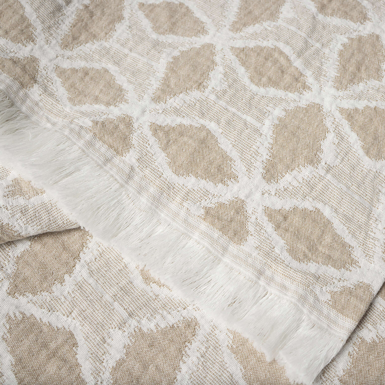 The Palomar Organic Throw blends intricate design with everyday comfort. Crafted from 100% GOTS certified organic cotton in Portugal, it features a matelassé weave inspired by traditional Japanese ikat patterns. This reversible throw showcases a geometric design on one side and a mirrored color palette on the other, offering versatile styling options. Finished with fringe detail and a 1" turned hem on the sides.