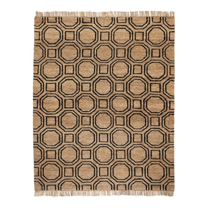 Interlocking inky tiles create soothing symmetrical shapes on a natural backdrop. Hardworking undyed jute is hand knotted for subtle texture and surprisingly soft surface interest, a modern and unique addition to any decor.