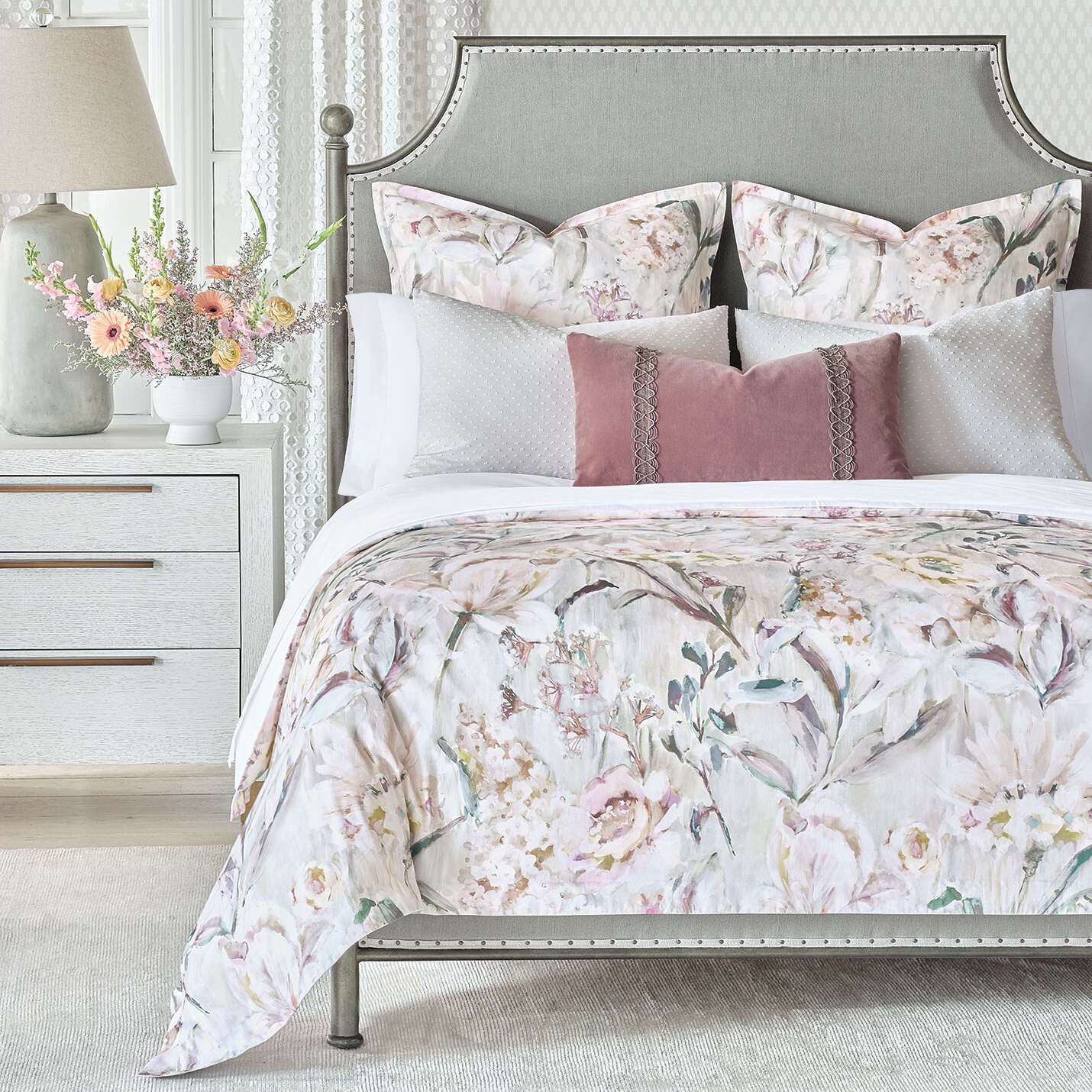 Delight in the sugary-sweet hues of Andromeda. Printed on silky sateen, this watercolor-inspired bouquet design delights in muted pastel. Paired luscious faux mohair and frilly fil-coupe, Andromeda blossoms with feminine charm and fine linens luxury.