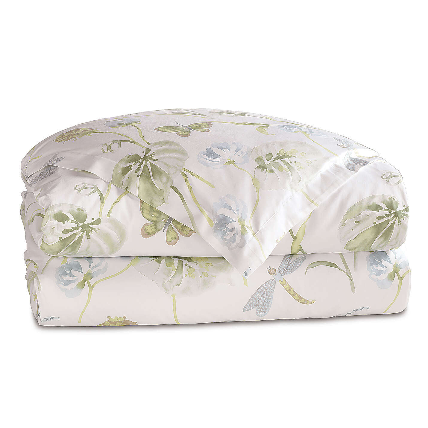 Duvet cover: 100% cotton with 300 thread count sateen in a botanical print. Reverses to Nuvola Classic White in Egyptian cotton. 2” self flange finish. Hidden button closure. Ties in all four corners for easy comforter attachment. Comforter inserts sold separately.