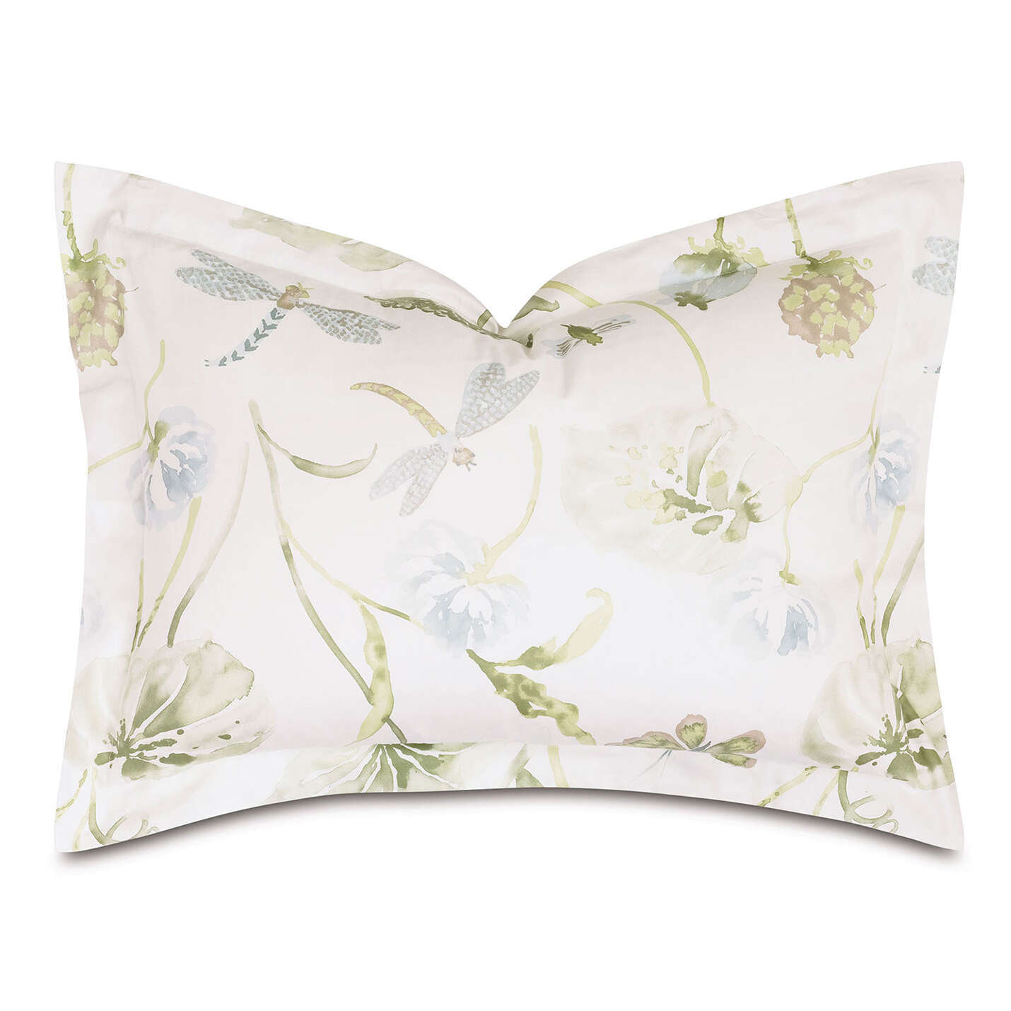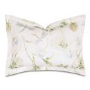 Sham: 300 thread count sateen fabric in a botanical print. Self-backed in Carlotta Haze. 2” self flange edge finish.