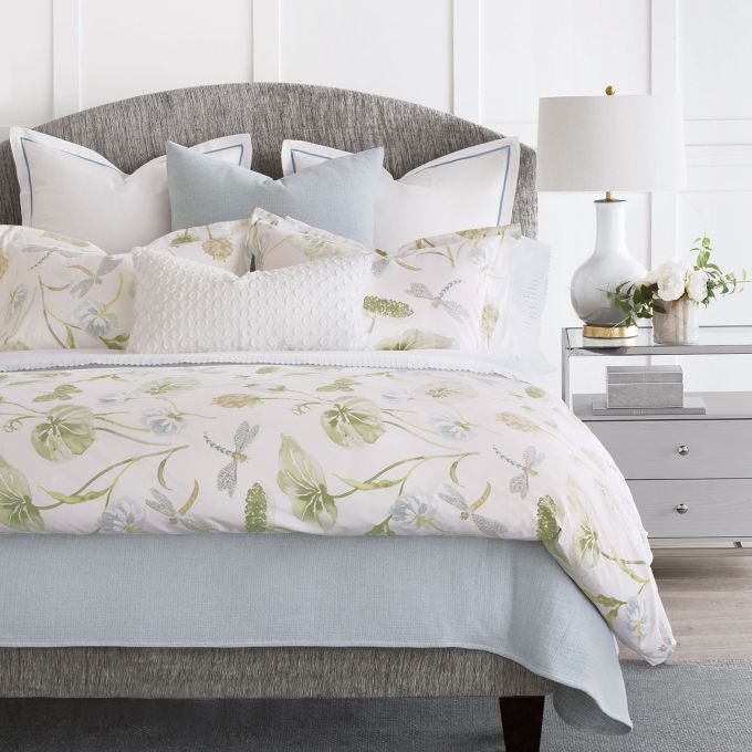 Carlotta evokes lazy and carefree summer days by the lakehouse. With the lightness of watercolors, sprightly dragonflies and budding lotus flowers grace the surface of this serene pattern. Its soft sateen finish completes Carlotta's peaceful and sophisticated look.