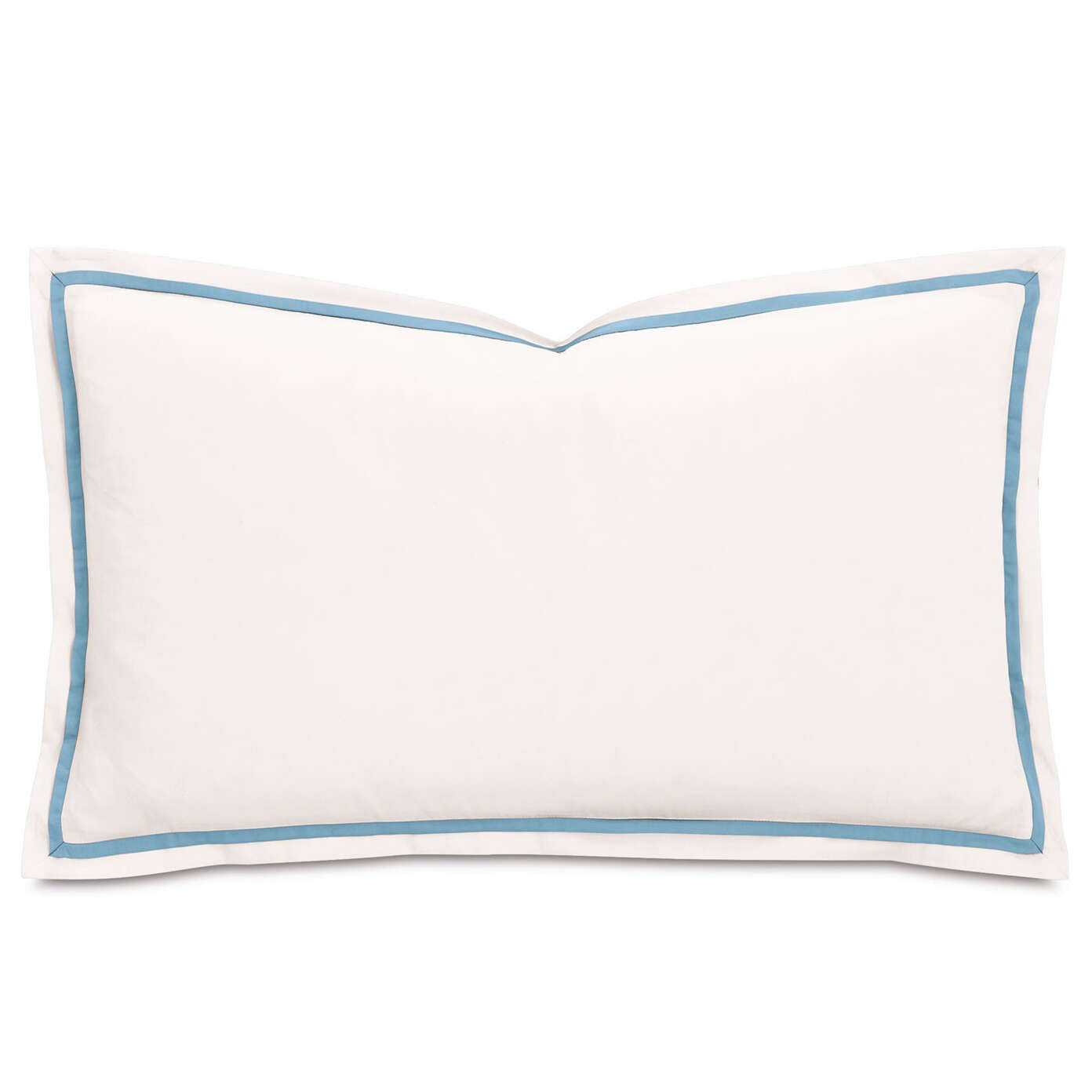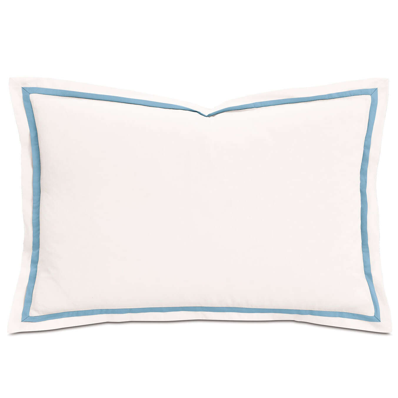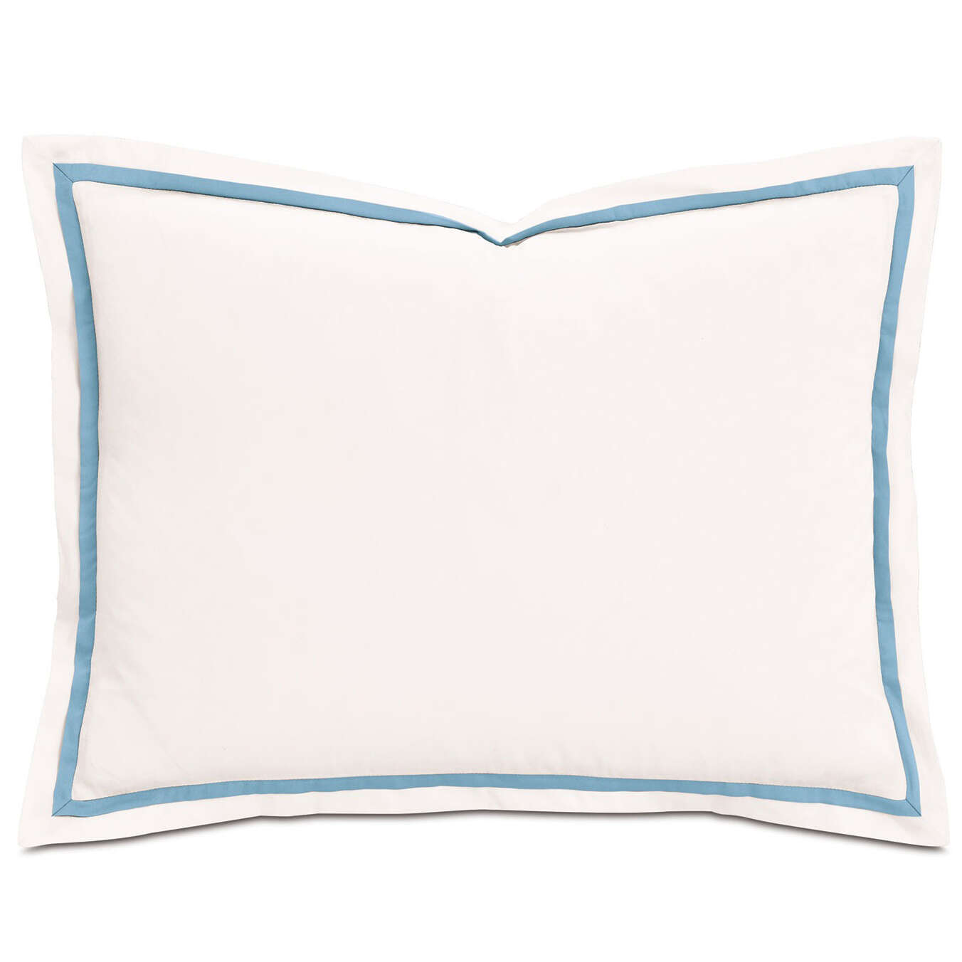 Mitered Duvet Cover: 100% cotton duvet cover with Stanza Sky. Ribbon mitered around the edge. Self-backed in Nuvola Classic Ivory. 1.5" mitered flange edge finish. Button closure for easy use.