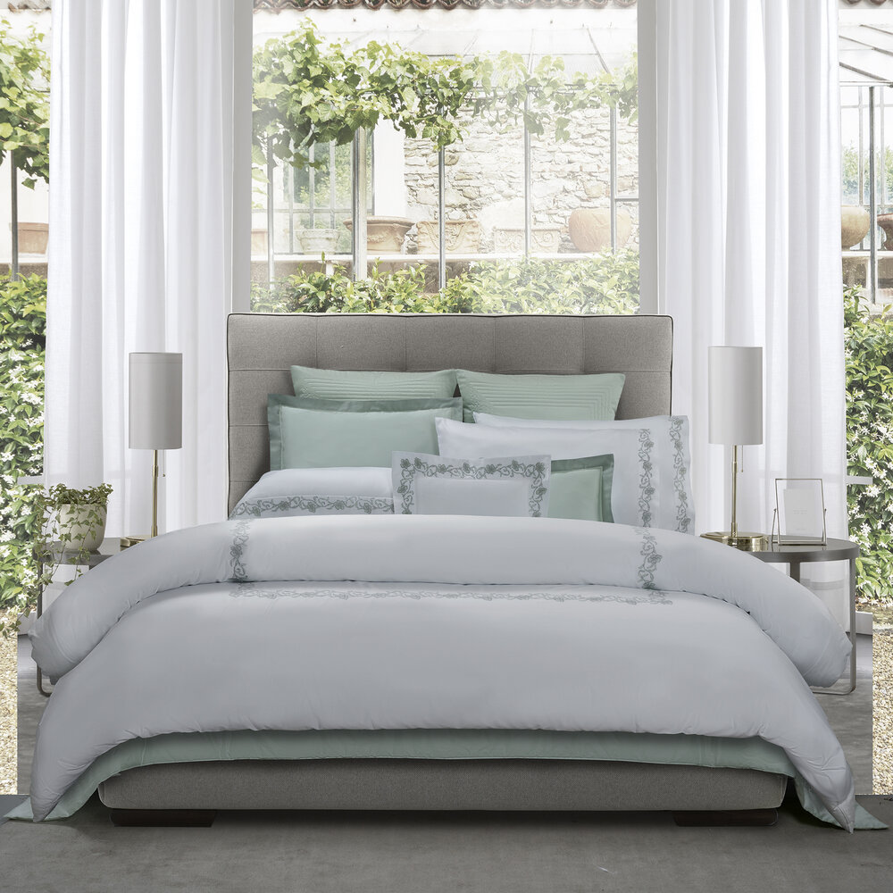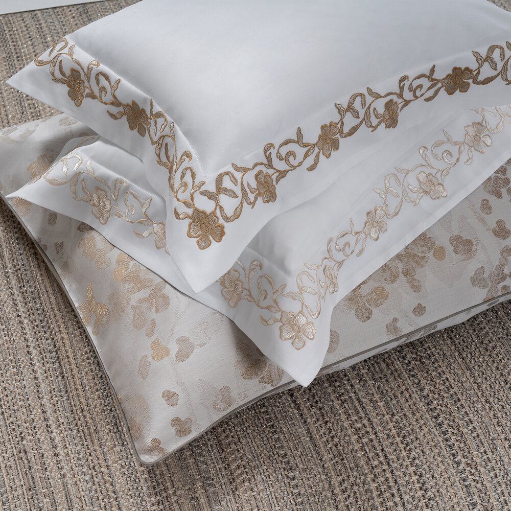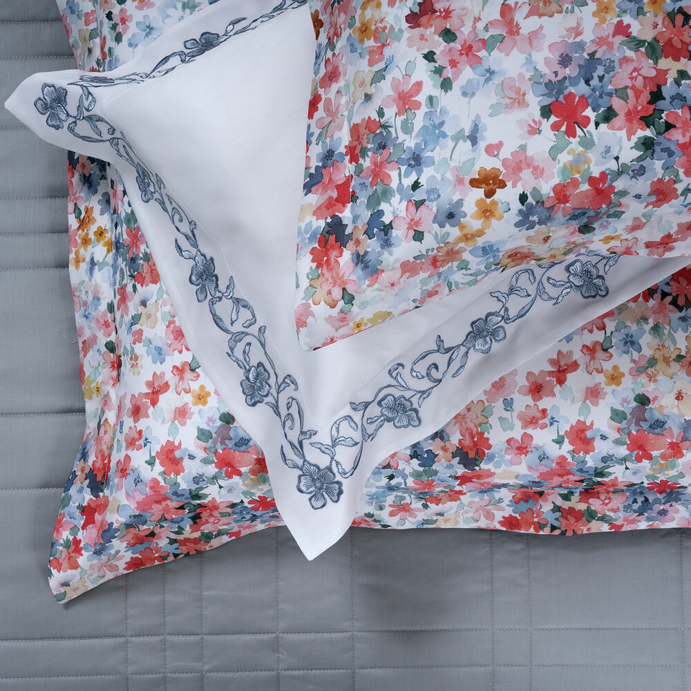 A Floral Enchantment inspired by the Renaissance. The Annabella design has been created by looking at the flower garlands that frame La Primavera by Sandro Bollicelli with grace and harmony. Each Flower has been carefully chosen to tell the story of beauty, rebirth and delicacy of the naturalistic design. Dea wanted to translate that timeless imagery into a textile design, where nature becomes poetry and the bed turns into a secret garden. The result is a precious and enveloping embroidery that pays homage to art with its purest expression.