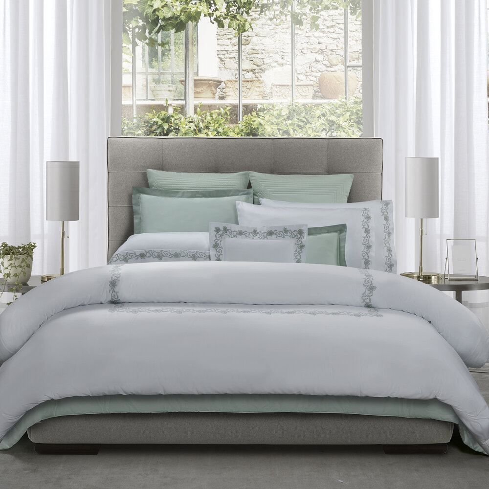 A Floral Enchantment inspired by the Renaissance. The Annabella design has been created by looking at the flower garlands that frame La Primavera by Sandro Bollicelli with grace and harmony. Each Flower has been carefully chosen to tell the story of beauty, rebirth and delicacy of the naturalistic design. Dea wanted to translate that timeless imagery into a textile design, where nature becomes poetry and the bed turns into a secret garden. The result is a precious and enveloping embroidery that pays homage to art with its purest expression.