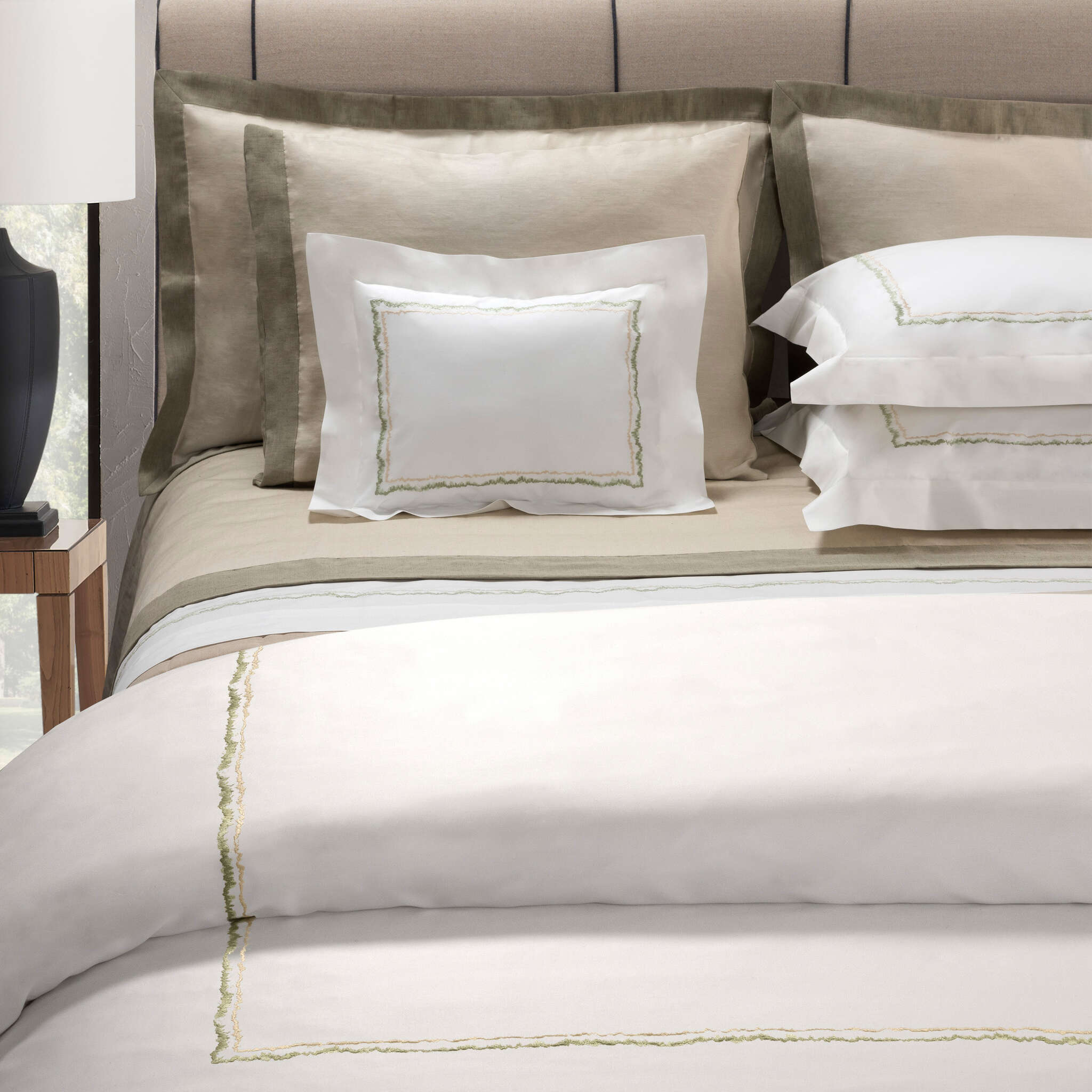 Dea offers matchless hand embroideries made entirely in its Tuscan workshops. With the Arno Collection, embroidery acquires a particularly modern look thanks to the distinctive, highly stylized design that frames the shapes and emphasizes the beauty of the fabrics.