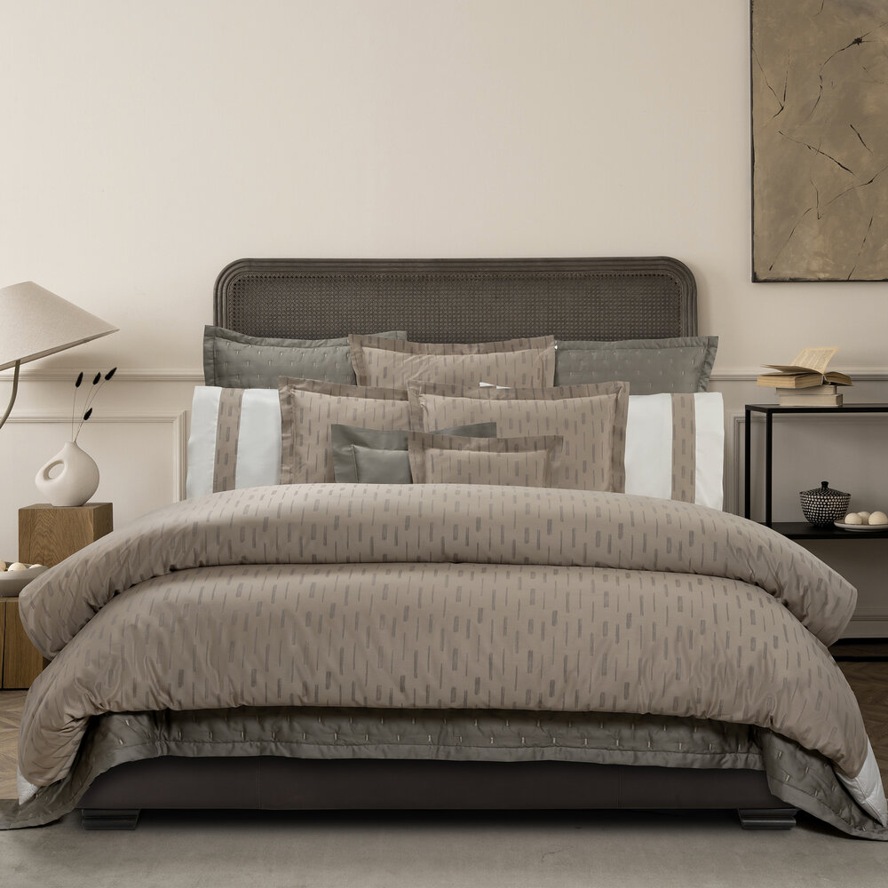 Pillowcase: Solid raso cotton sateen with jacquard inset.