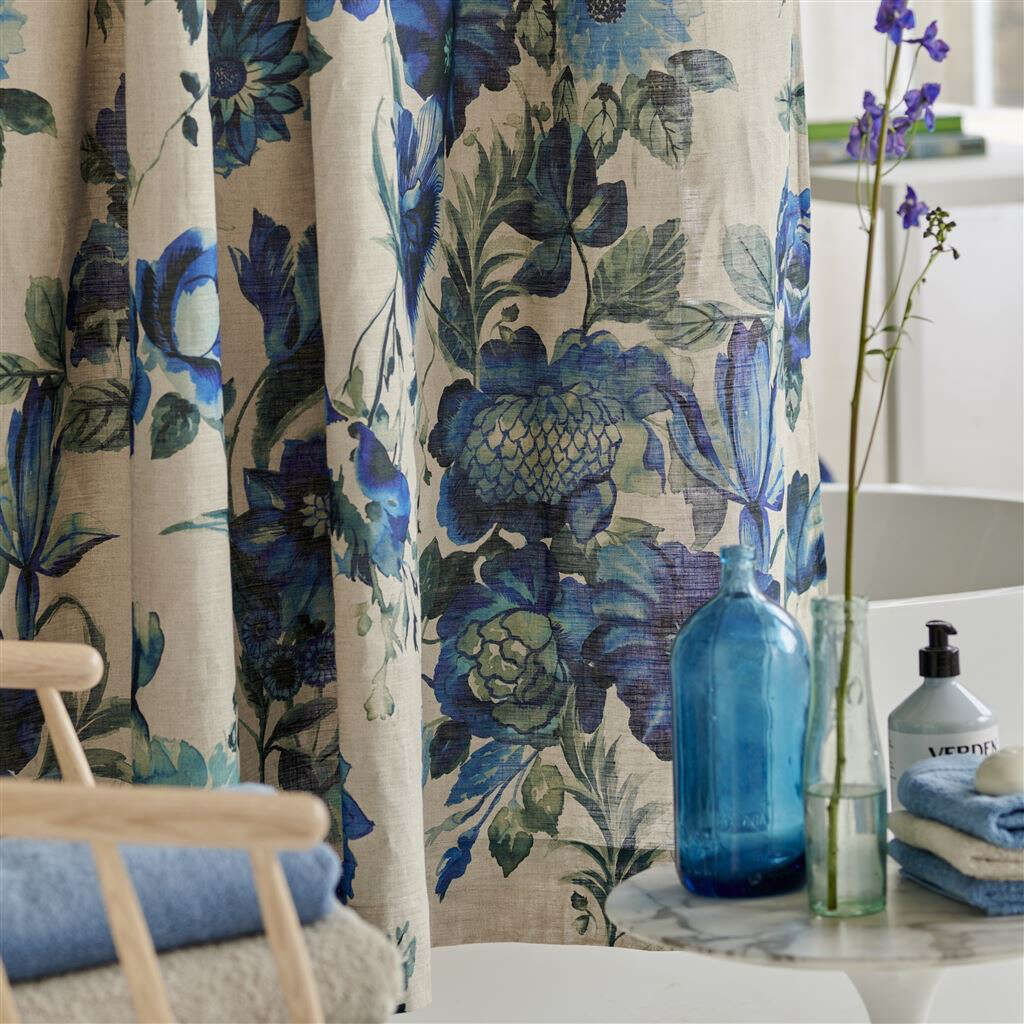 This stunning floral shower curtain takes inspiration from the art of Hirigana painting - a celebration of nature with dramatic inky washed brush strokes in rich cobalt and indigo blue hues, digitally printed onto a luxurious 100% natural linen .The perfect complement to your bathroom or en-suite scheme. To be used with a waterproof liner. OEKO-TEX Standard 100 approved for added confidence.