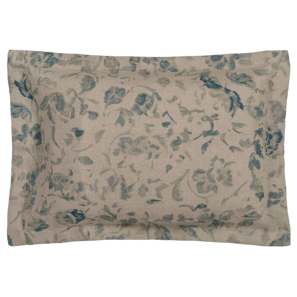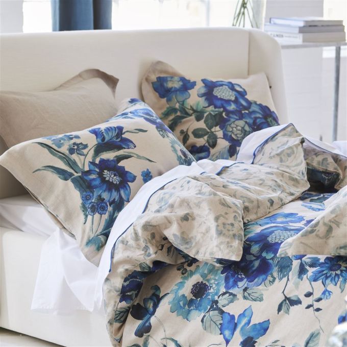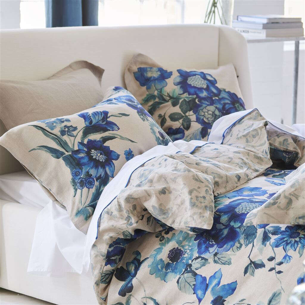 This stunning floral bedding print takes inspiration from the art of Hirigana painting - a celebration of nature with dramatic inky washed brush strokes in rich cobalt and indigo blue hues, digitally printed onto a luxurious 100% natural linen with a small scale inky floral on the reverse. Shams finished with a smart linen trim detail. This bedlinen will be sure to make stylish statement in your bedroom scheme and coordiates beautifully with our fabric, wallpaper and accessory ranges.