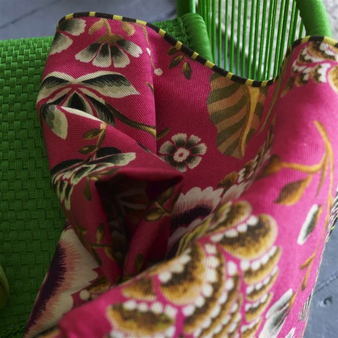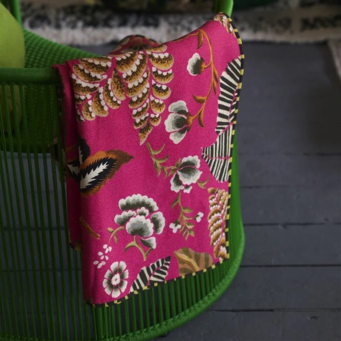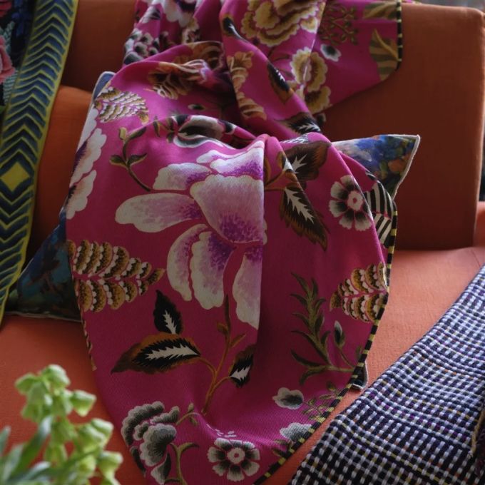 Make a bold statement with this vibrant floral interior throw. Dramatic large scale graphic flowers are placed in a mirrored damask form on a bright cerise pink ground. This stylish throw is digitally printed onto a luxuriously soft merino wool ground and finished with a hemmed edge. OEKO-TEX Standard 100 approved for added confidence.