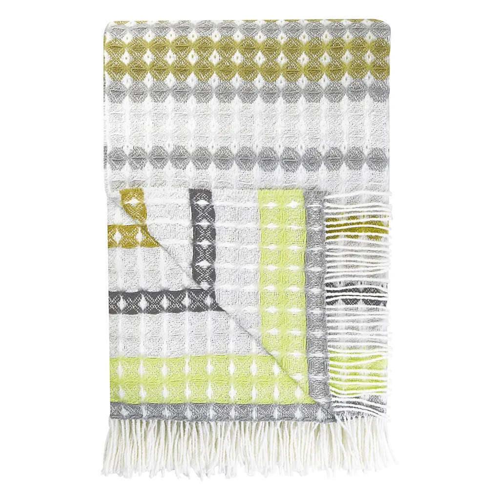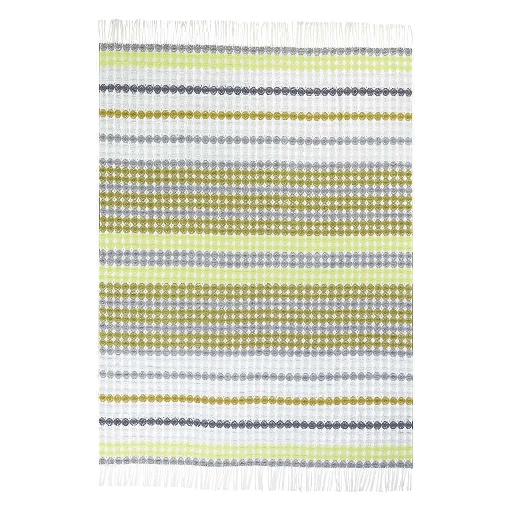 For a layer of warmth and comfort in your interior scheme with this chunky waffle weave throw in a sophisticated striped pattern with grey, white, natural and moss. This interior throw is woven in soft blended yarns and finished with a fringed edge.