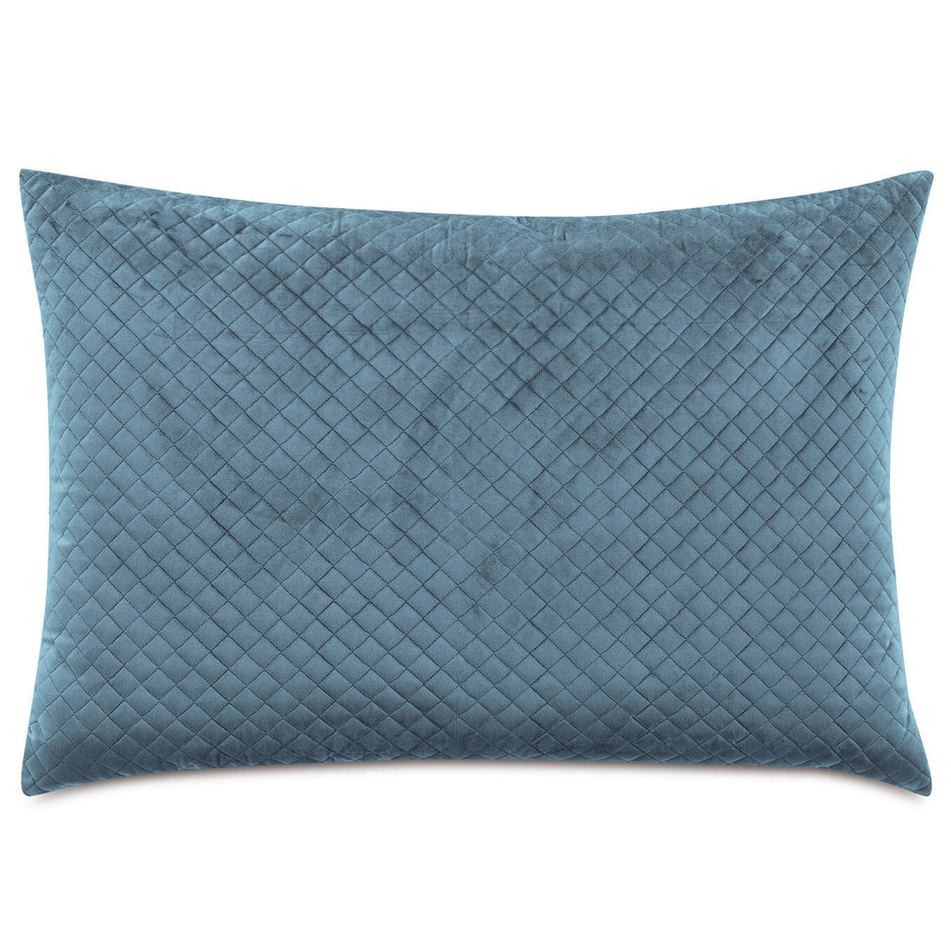 Quilted Dutch Euro sham in a blue washable velvet fabric. Self-backed in Bruton Ocean. Knife edge finish. At 27x37, this pillow is the height of a regular Euro Sham and the width of a King Sham. Its larger size showcases a muted blue velvet, quilted in a small diamond pattern. Two Dutch Euro Shams will perfectly span a King size bed, while one will fit across a Twin.
