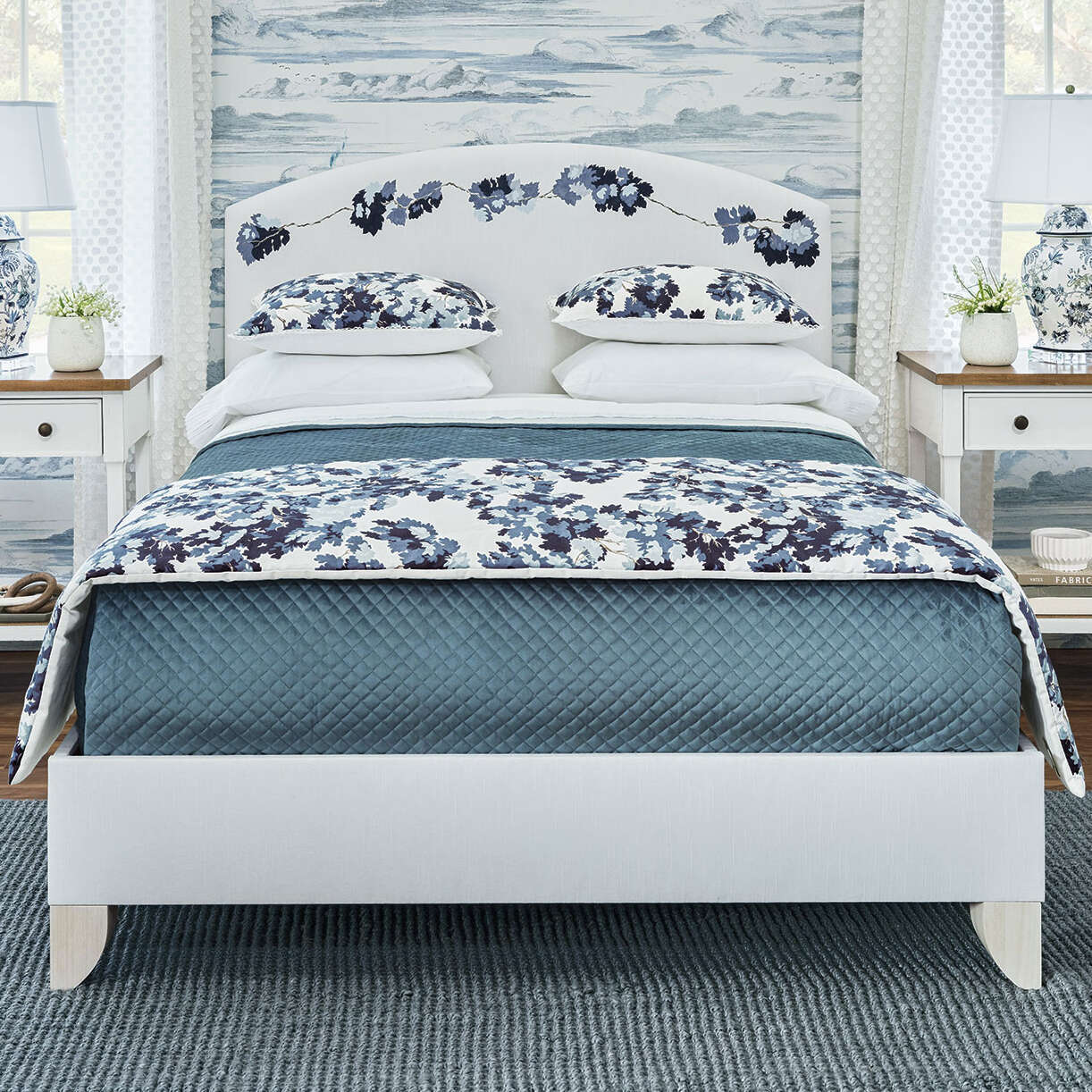 Quilted Coverlet in a blue washable velvet fabric. Reverses to Nuvola Classic Sky. Squared mitered corners.