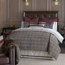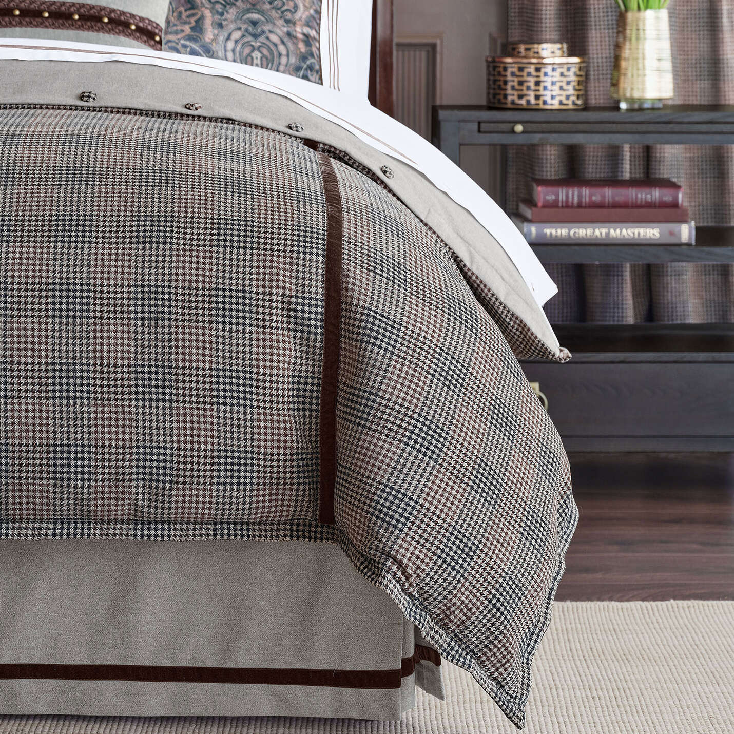 Woven houndstooth plaid duvet cover or comforter with brown ribbon sewn on seams