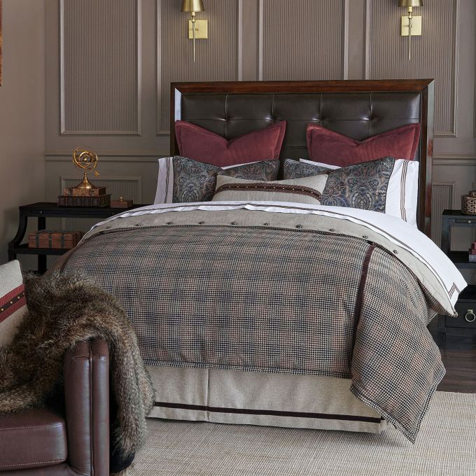 Step into an old-world library with Cristobal. This handsome, tailored collection is filled with classic menswear details: houndstooth plaid, velvet stripes, and real leather hide. Its rich rust and brown color palette, brushed gold nailheads, and intricate damask pattern add a moody, yet distinguished touch. Styled with pleated draperies or a studded leather ottoman, Cristobal is fit for a true gentleman.
