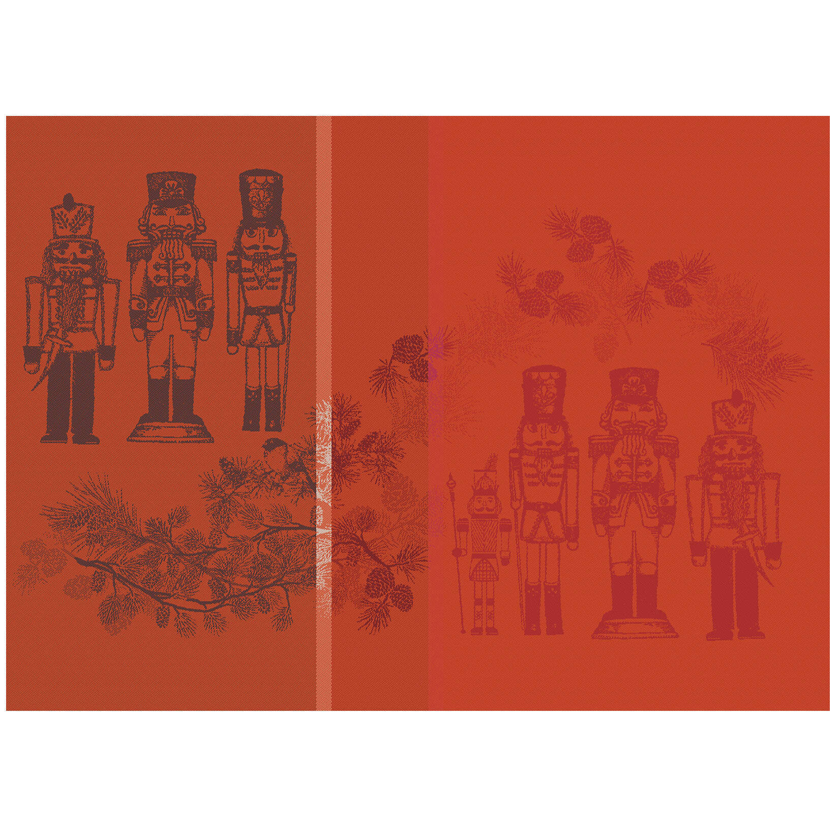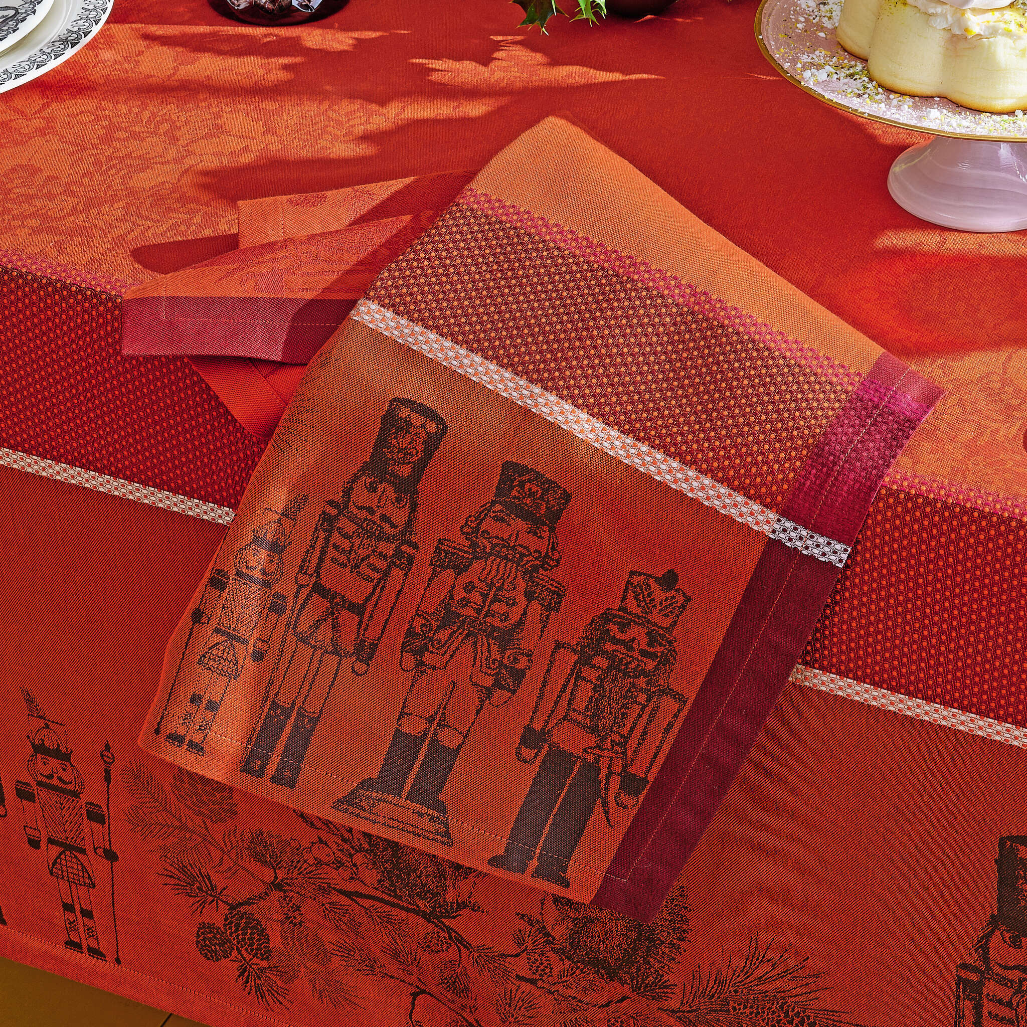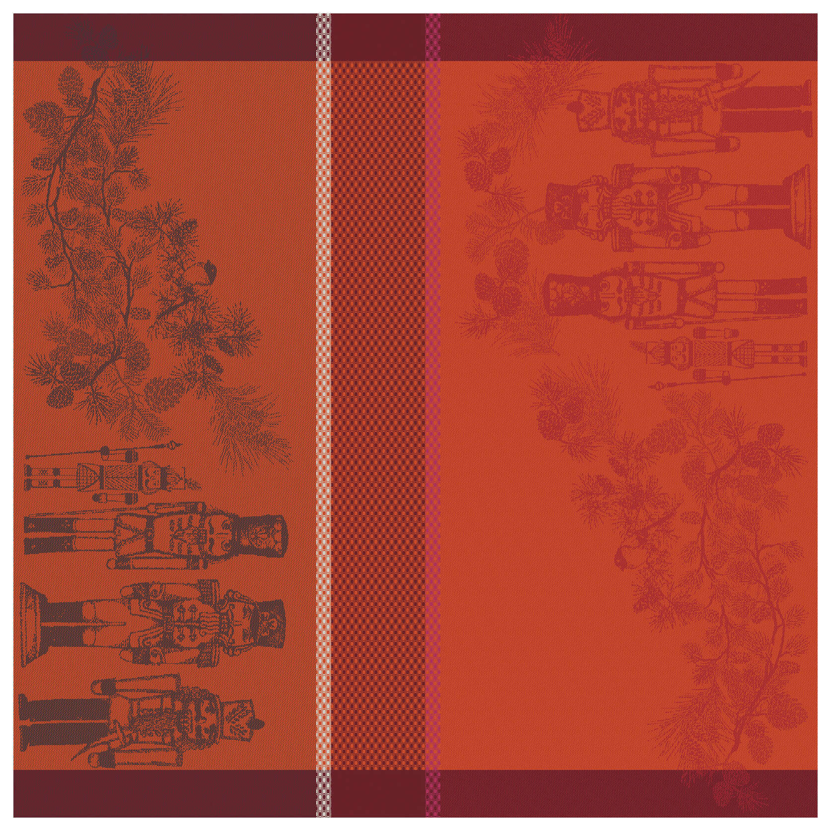 The Casses Noisettes Rouge Festif Tablerunner is woven in France from 100% extra-long staple cotton and finished with a Green Sweet stain-resistant treatment to help guard against spills while preserving a soft, natural feel. Its festive red jacquard design is accented with a detailed border of nutcrackers and holly in black and white, showcasing the artistry of carefully layered threads. Elegant and cheerful, this runner brings the warmth and charm of a classic French Christmas to any holiday table.