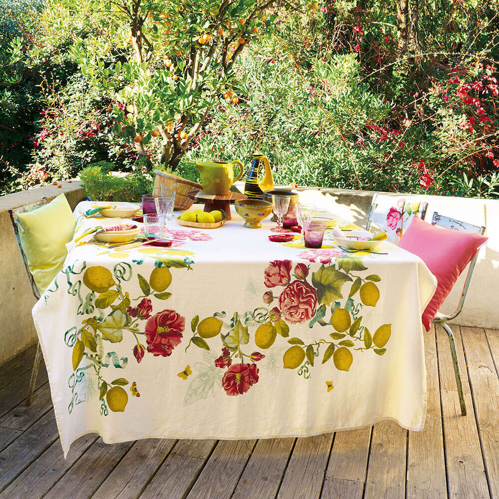 Summer is in the air and it's time for a well-deserved pause. Relax in the romantic joy of fresh, yellow citrus and lush, pink flowers with the cream, cotton-linen blend Citrons De Menton Romance Tablecloth. This printed design was crafted from original artwork, hand-drawn by our in-house team of textile artisans & designers in France. Combining the best qualities of cotton and linen, this fabric blend seamlessly enhances the table with its effortless appearance while providing durability and long-lasting performance. Celebrate the season with the Citrons De Menton Romance Tablecloth, with its durable cotton-linen blend featuring intricate hand-drawn designs of lemons and pink florals that is perfect for those bright, sunny summer days.