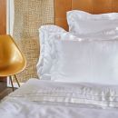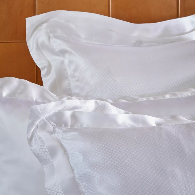 Made from 100% pure white mulberry silk and featuring a subtle diamond trellis pattern that is effortlessly sophisticated, the Eva bedding collection from Gingerlily adds a touch of timeless elegance to any bedroom setting. Subtle detailing in our collection includes a double border on each of the shams which is echoed with a triple layer of silk running across the width of this beautiful white silk duvet cover. An enduringly popular design in the Gingerlily collection, Eva is made from pure long strand mulberry silk. Unlike cotton, silk does not absorb moisture helping to keep skin and hair soft, smooth and free from fine lines and wrinkles.