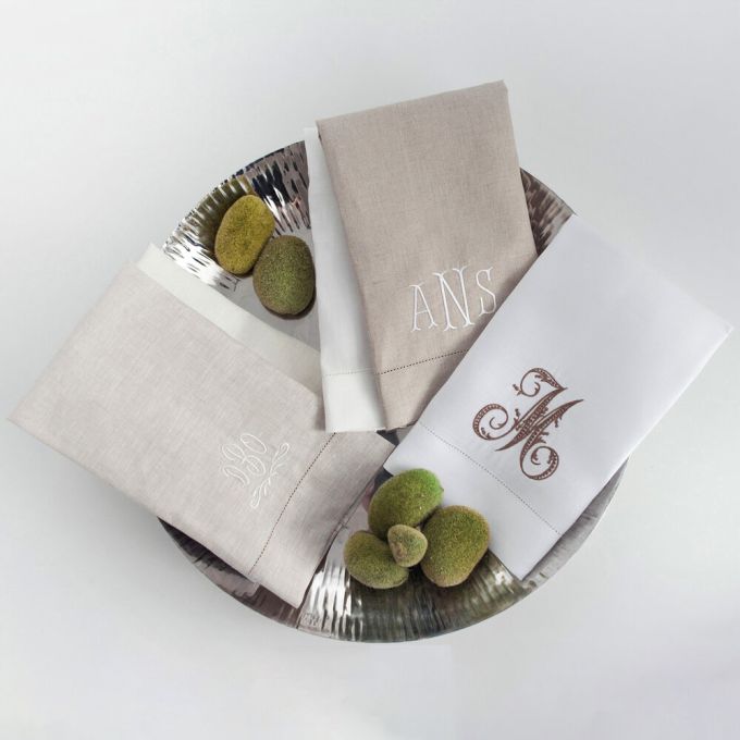 A deep-colored 100% Italian linen guest towel, with a tone-on-tone, hand-guided hemstitch finish and the option of a single letter monogram (M).