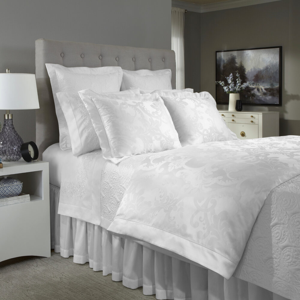 The embodiment of European luxury, our 700 thread count, Floral jacquard coordinates with our Villa solid sateen, making for a bed that feels even better than it looks.