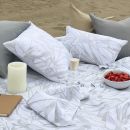 Decorative throw pillow made from pure 100% linen printed. Double-sided: back is solid white. Medium weight fine Italian linen. Clean knife-edge finishing with invisible zipper. Inserts sold separately: 10% Goose Down 90% Duck Feather in a premium cotton shell, designed to fill the cover to the corners. Colors: Aqua , Metallic.