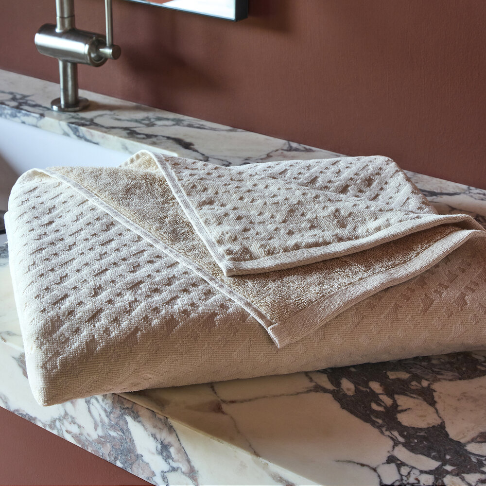 100% cotton velour terry, sculpted with a soft, enveloping hand, designed to deliver a plush sensation the moment you step out of the bath.