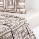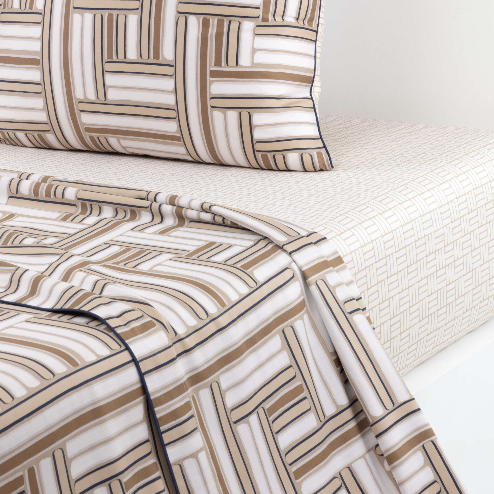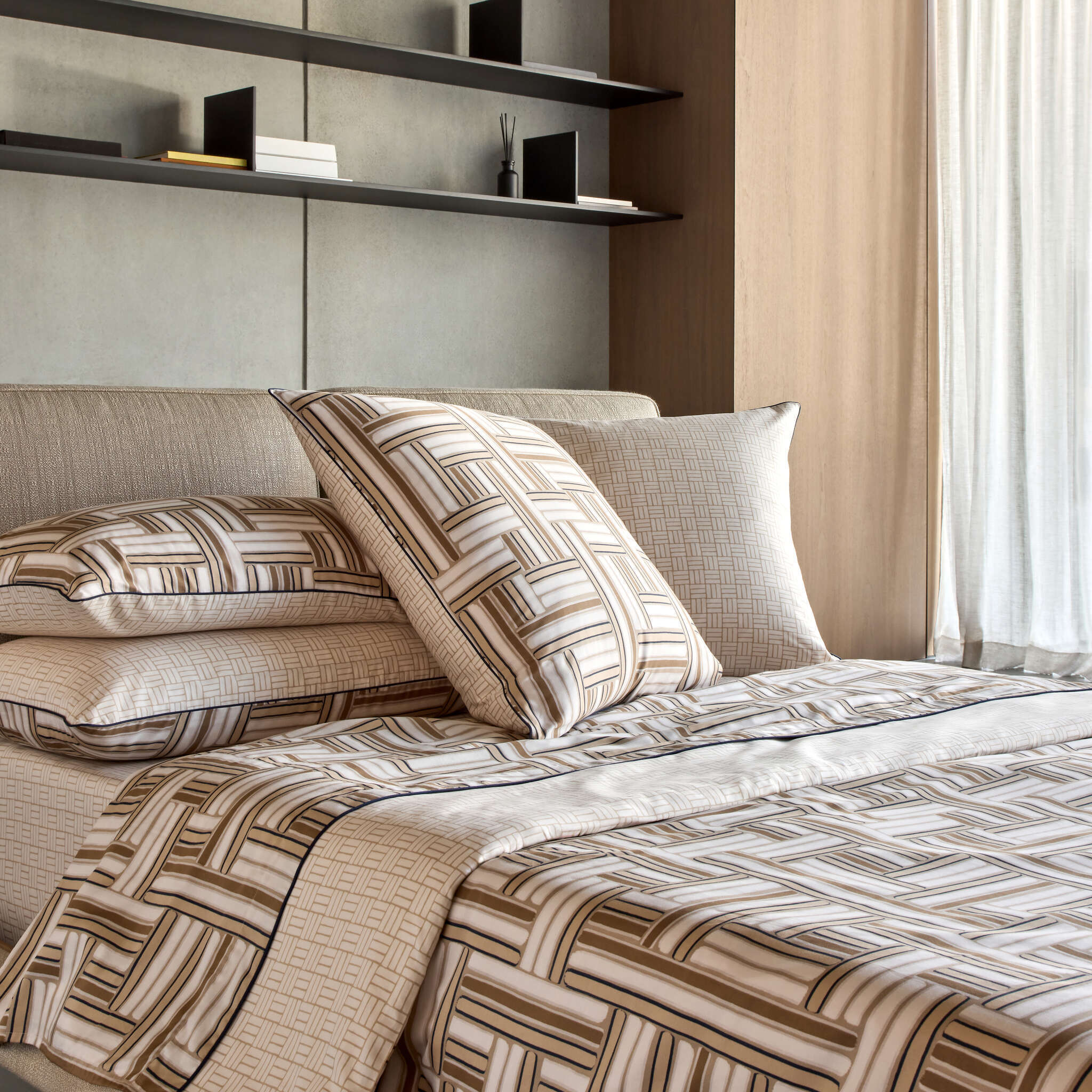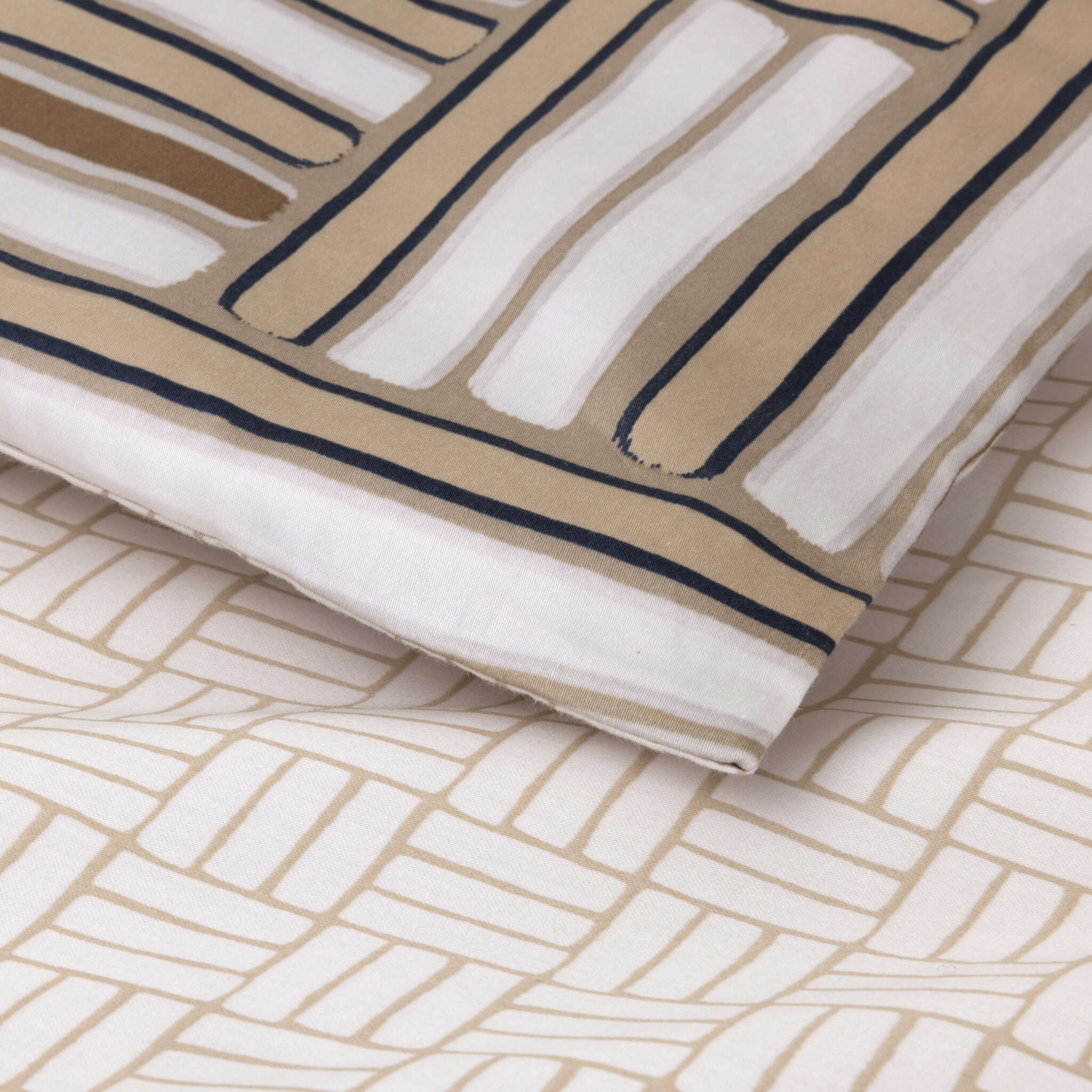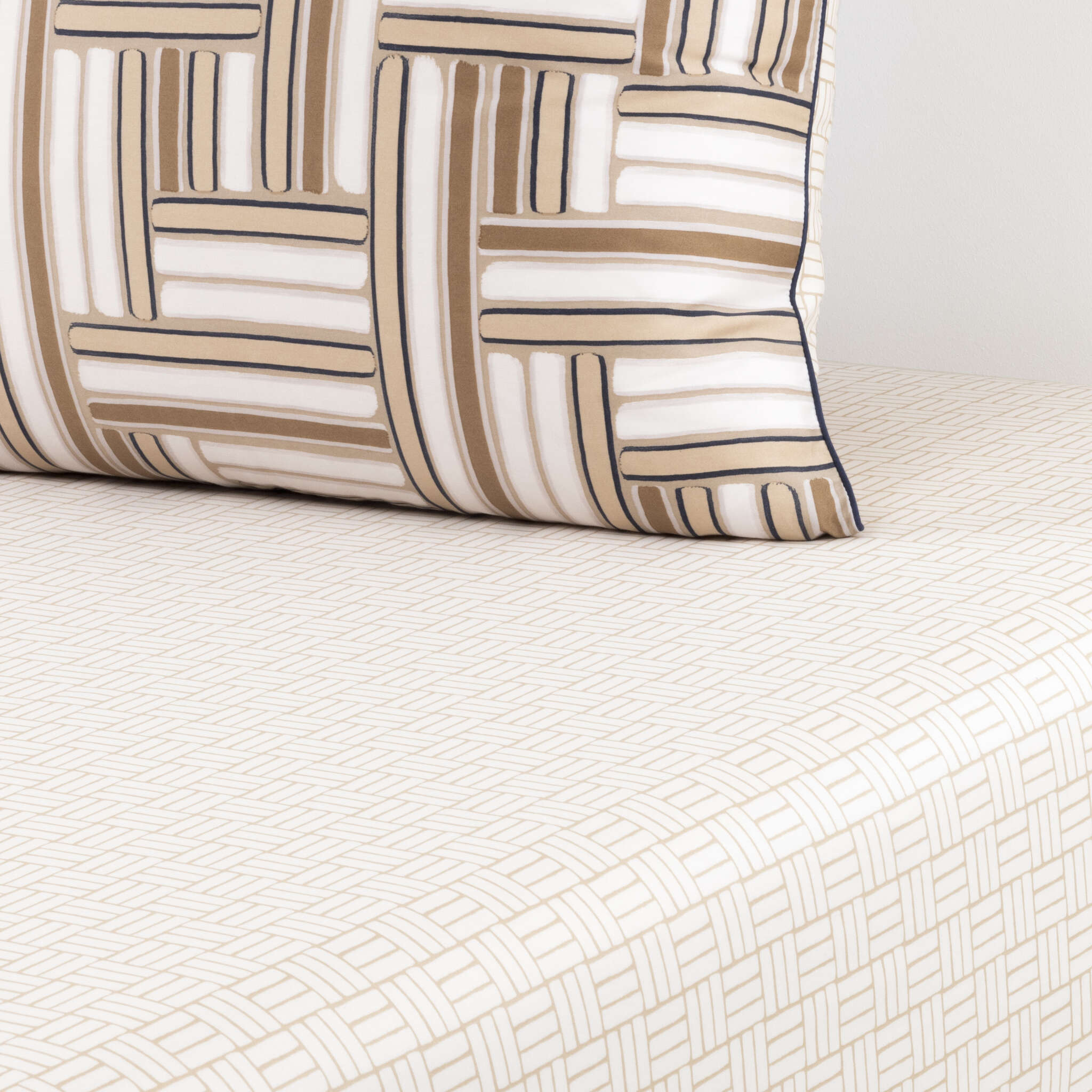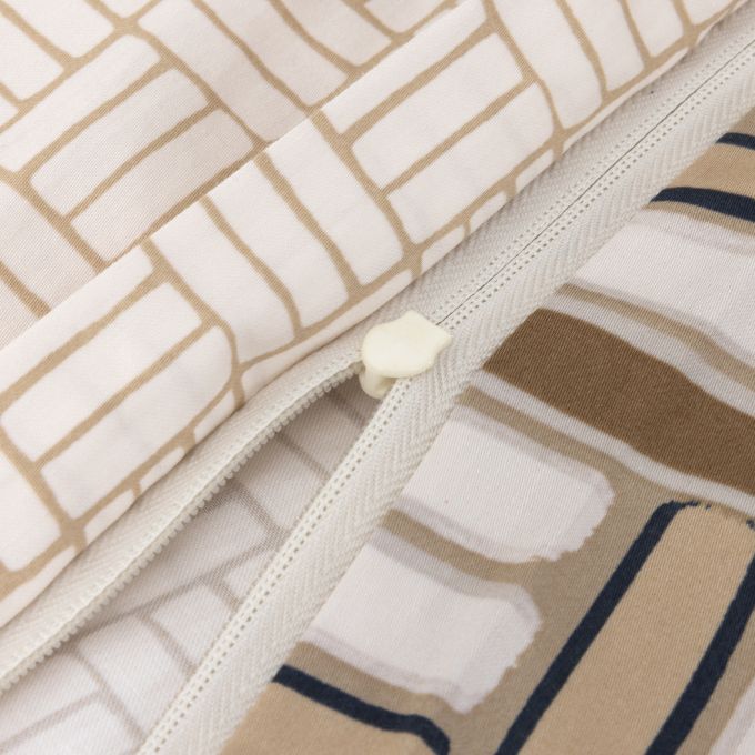 Pictorial and contemporary, the Dédale bed set has an undeniable decorative presence. Under the brush, subtle beige tones are enhanced by an ink-like design. On the reverse, a discreet geometric pattern in light sand tones. The sateen is crafted from high-quality cotton. Lustrous and radiant, sateen is highly valued at BOSS for its softness, silky appearance, and suppleness.