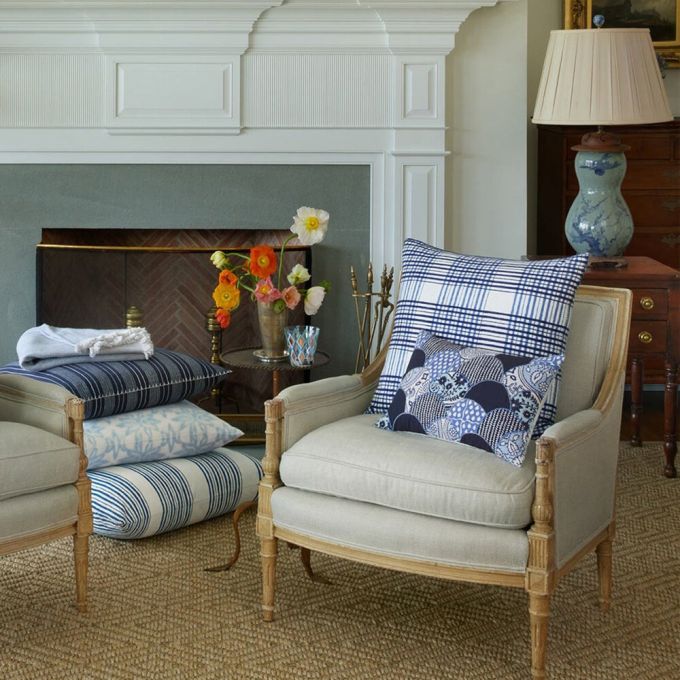 Classic plaid reimagined with block printed indigo/terracotta and azure stripes/peach lines.
