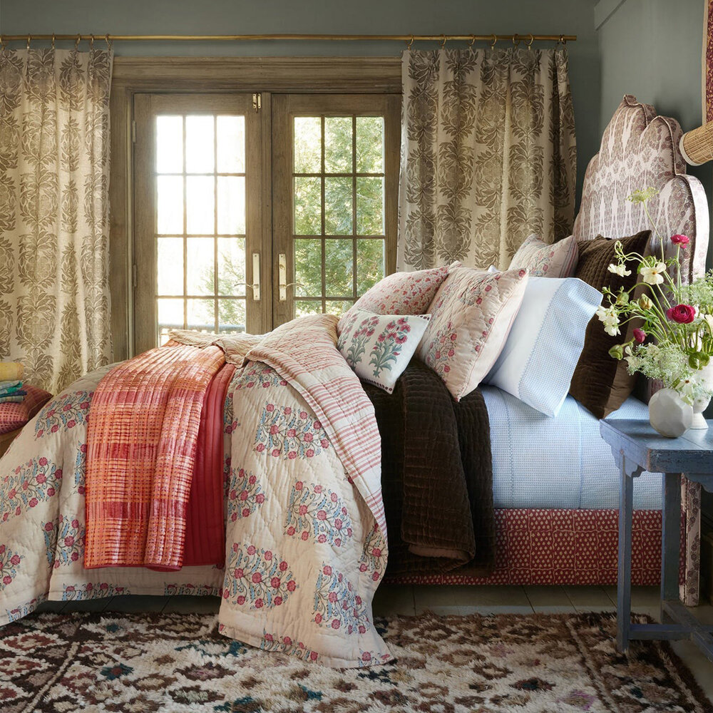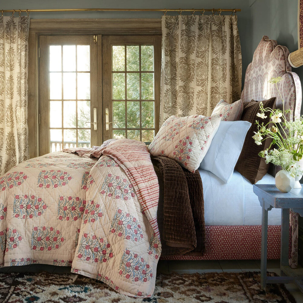 Printed with a romantic floral pattern rooted in classical block printing shapes, brought to life in soft shades of azalea and blush. Hand quilted on super soft cotton slub chambray, the same as our best selling Vivada quilts.