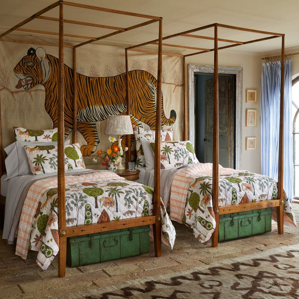 A bold jungle toile brimming with autumn foliage, prowling jaguars, stately horses and elephants on parade.