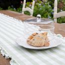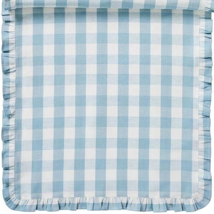 A classic gingham table runner is embellished with a ruffled edge for a touch of romantic country charm and easy elegance that’s perfectly lovely for garden parties, summer fêtes—and every day in between.