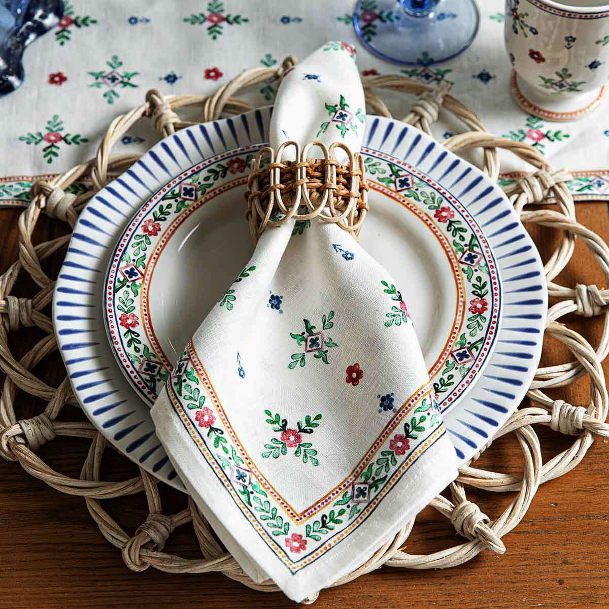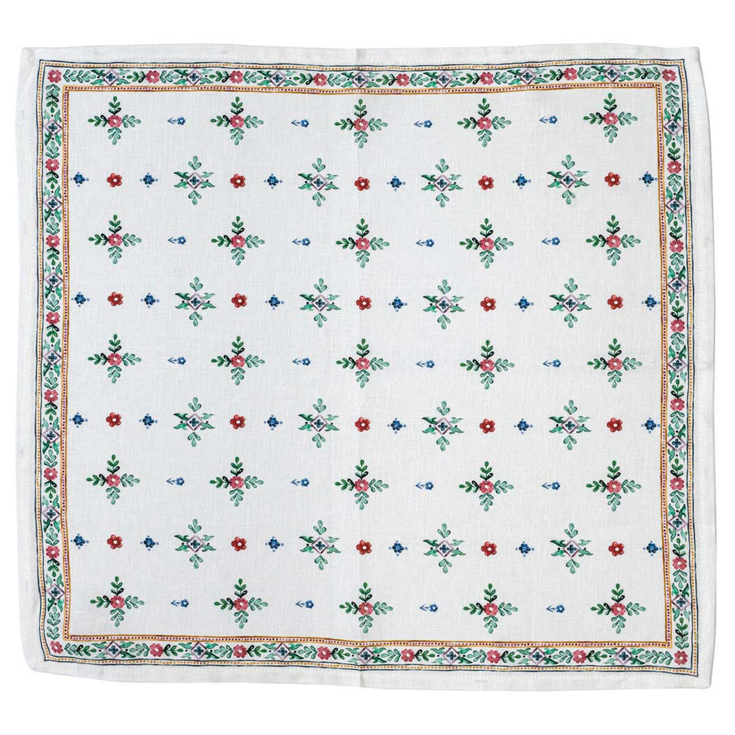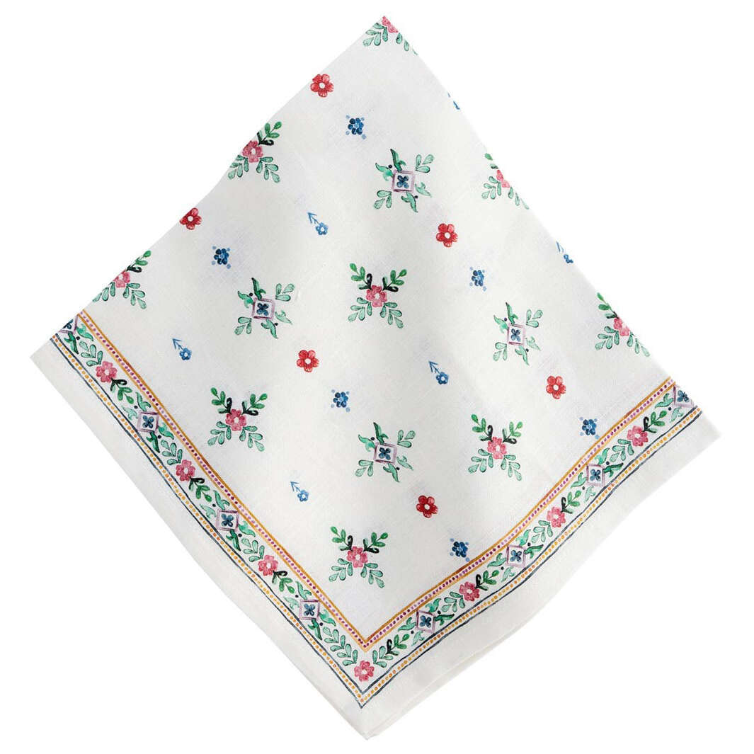 A folkloric wildflower motif from the Austrian alps in a playful pastoral pattern of edelweiss and bellflowers is done in joyful colors on a snowy white background. Vibrant and versatile, this linen napkin is designed to delight year-round, from summer’s al fresco entertaining to winter’s holiday gatherings.