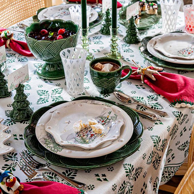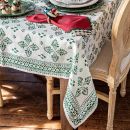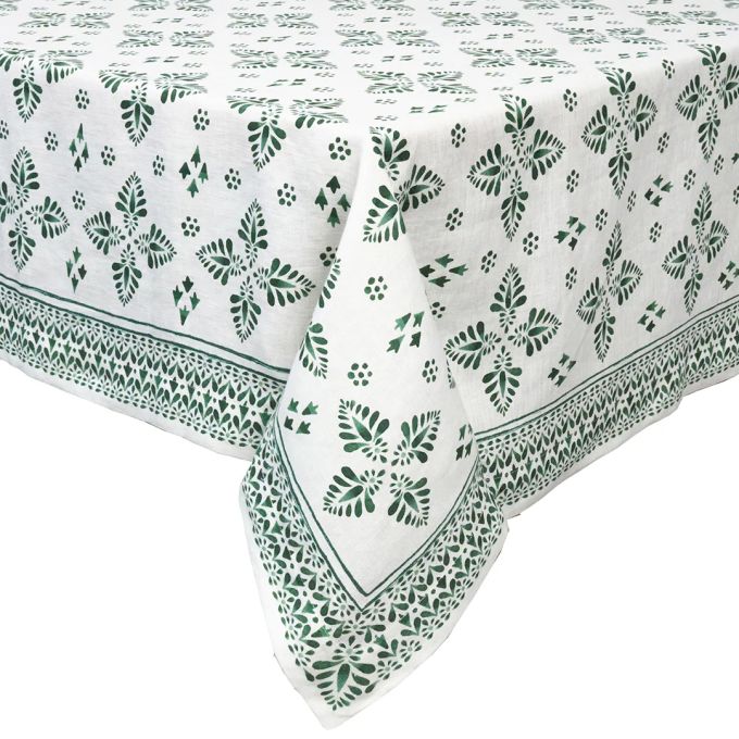 Made of 100% linen and inspired by traditional European hand-painted tiles, our fresh and folkloric pattern in evergreen and white makes this tablecloth a beautiful backdrop for entertaining for all seasons. Style it as formally or casually as you like—from winter holidays to summer cookouts, and every day in between.