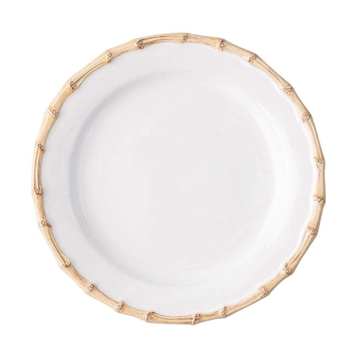 From our Bamboo Collection- A clean modern shape is encircled with the timeless aesthetic of bamboo for a look that translates across continents. Use this chic plate as a serving platter for appetizers or as a cake plate.