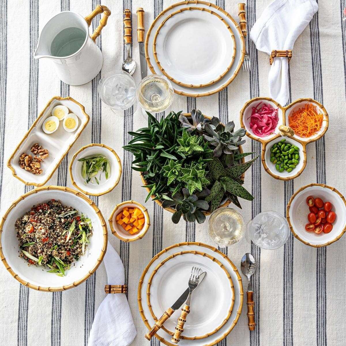 From our Classic Bamboo Collection- Add a splash of bohemian beauty to cocktail hour. Our bamboo-rimmed trio of ceramic serving bowls are united by a ring-shaped handle that makes transporting nibbles a breeze - from cocktail mixes on the veranda to homemade spiced nuts.