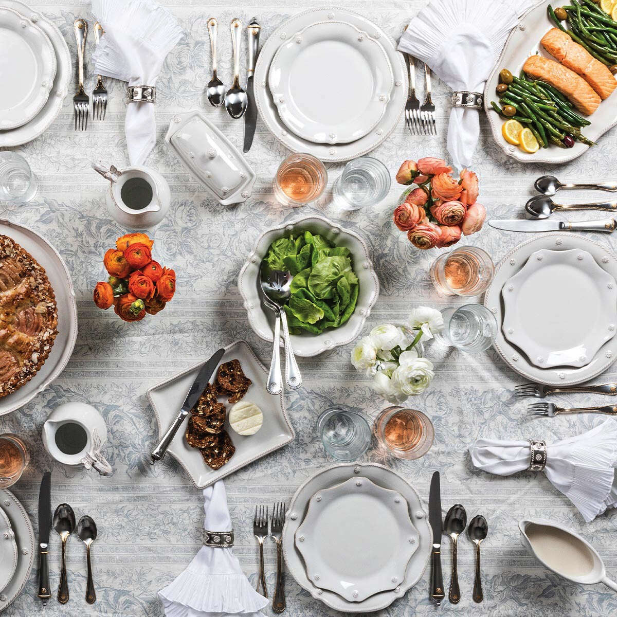 From our Berry & Thread Collection - Rimmed with our simple thread and adorned with a sprinkling of berries, our classic five piece setting in whitewash contains a round dinner plate, scalloped dessert/salad plate, round side/cocktail plate, tea cup and scalloped saucer.