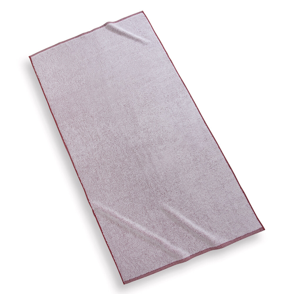 Bath towel features a sewn in hanger loop.