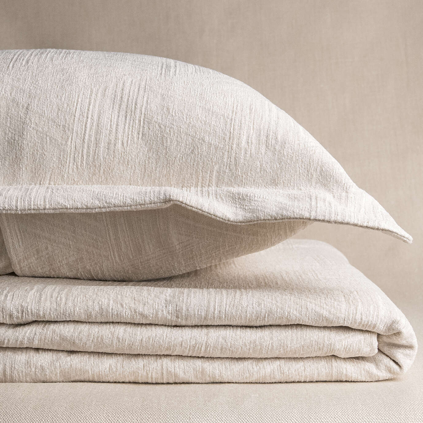 Entwined, one of our original and beloved patterns, is made of high and low lines of woven fibers. Our woven bedding is crafted with meticulous attention to detail, using carefully selected fibers and thoughtful design elements to transform your sleep space into a haven for rejuvenation and rest.
