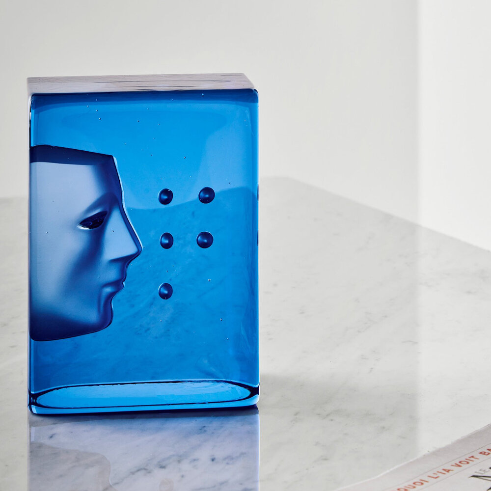 Azur is cast in graphite mold at Kosta Glassworks. The mold has an impression of one of Bertil Vallien's characteristic faces that has been blasted. The 2025 series is made in "Vallien blue" as the blue color has come to be known. "Blue is my favorite color, but it's not just a color, blue is a state of mind," as Bertil Vallien says.