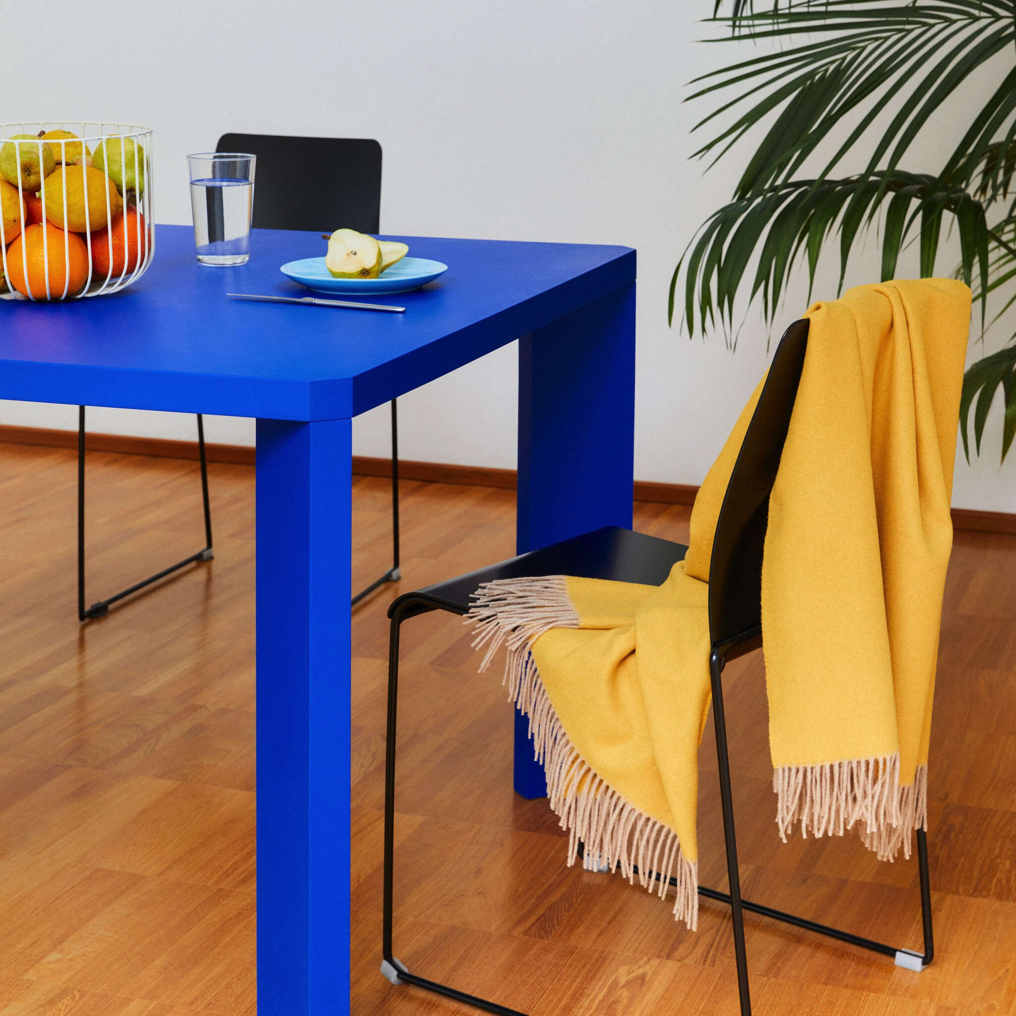 Throw in pure extra-fine merino wool. Available in different vibrant shades, the product boasts a classic double-sided structure. Its timeless design brings a touch of liveliness to the home, imbuing the living space with colour. Also great for travelling, this smooth and pressed-effect throw is a soft companion for moments away from home.