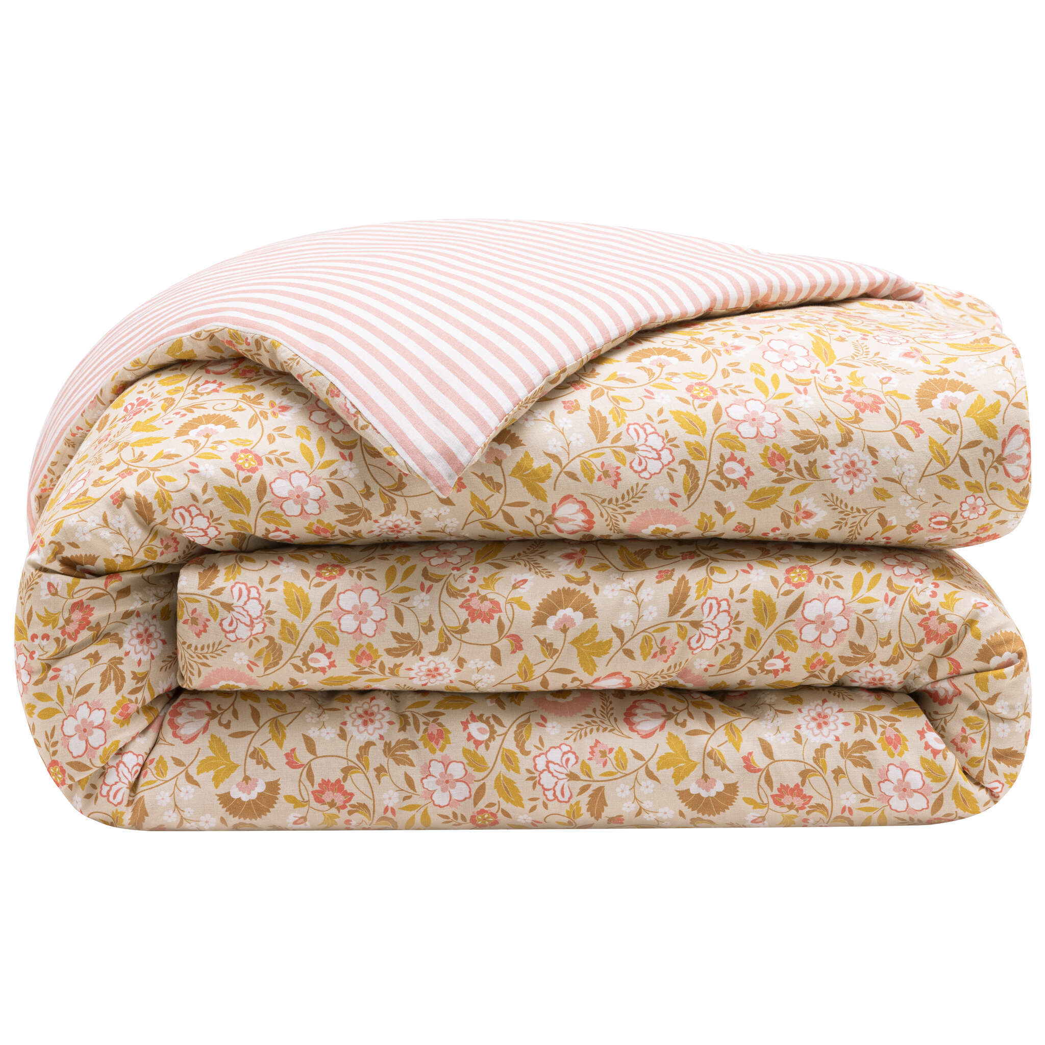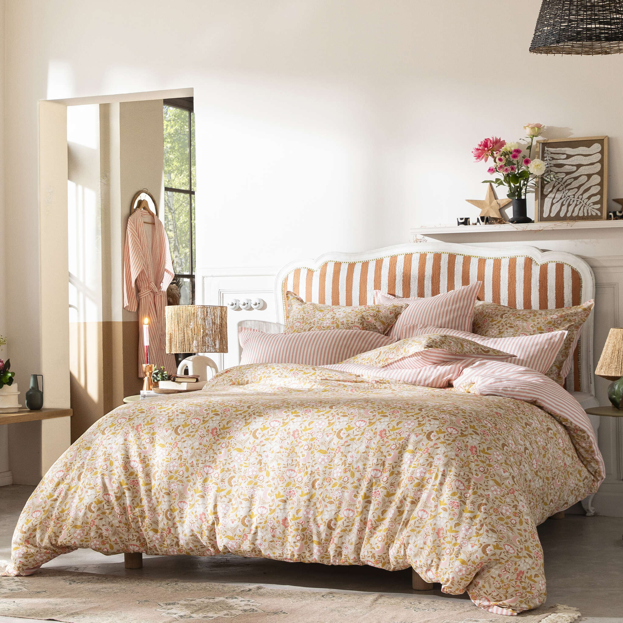 The nomadic spirit is reflected in the comforter cover. We love its reversibility: floral motif or fine stripes, you choose your favorite side.